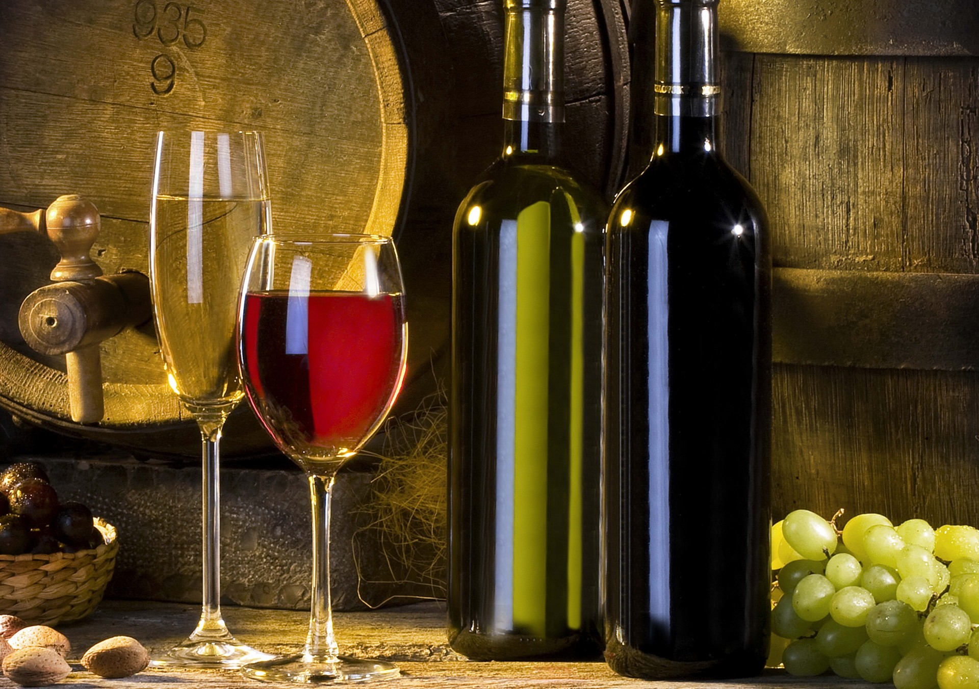 Vin rouge et blanc dans des verres et des bouteillesVin rouge et blanc dans des verres et des bouteilles