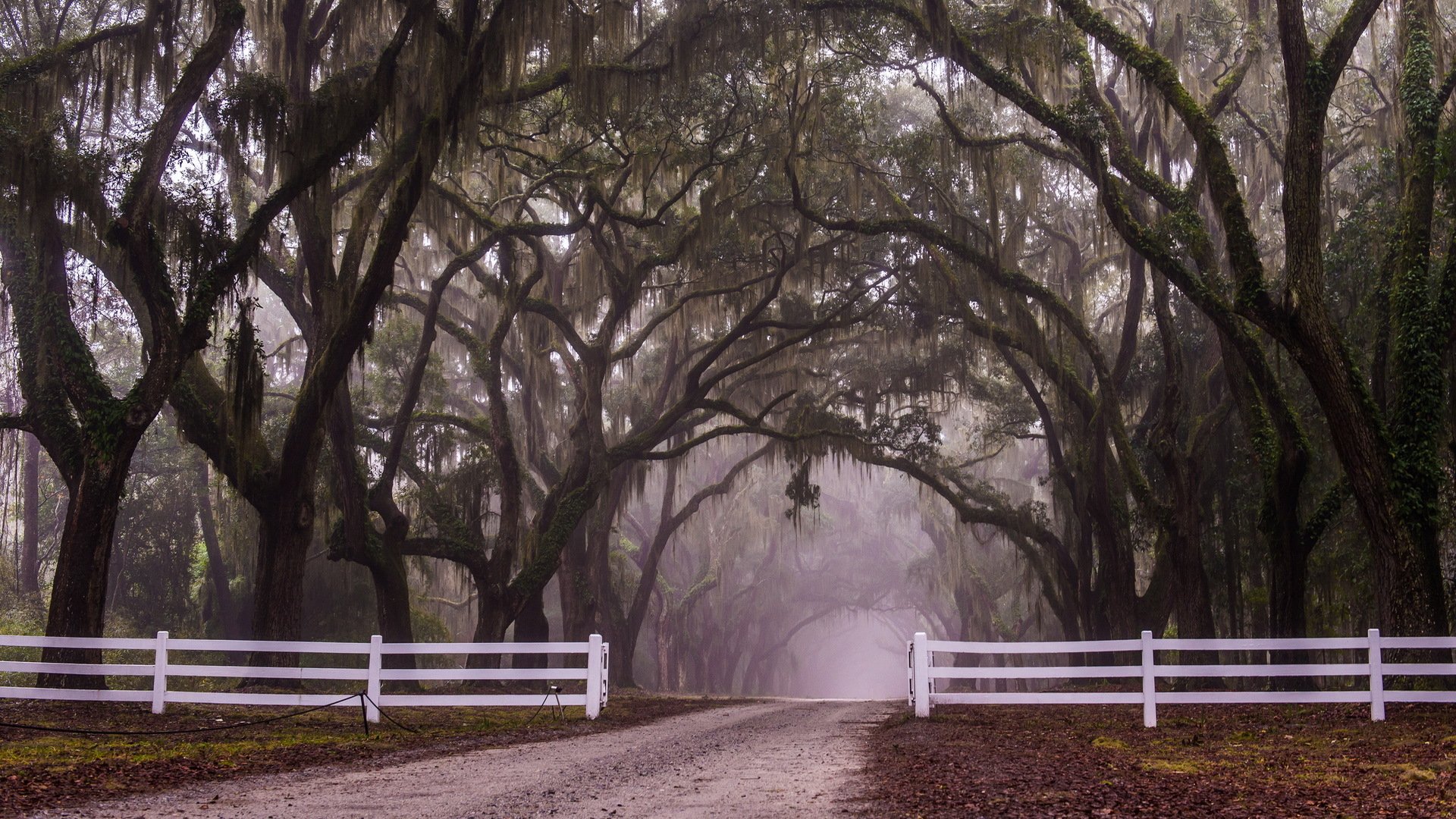 Route de la forêt avec un brouillard de couleur verteRoute de la forêt avec un brouillard de couleur verte