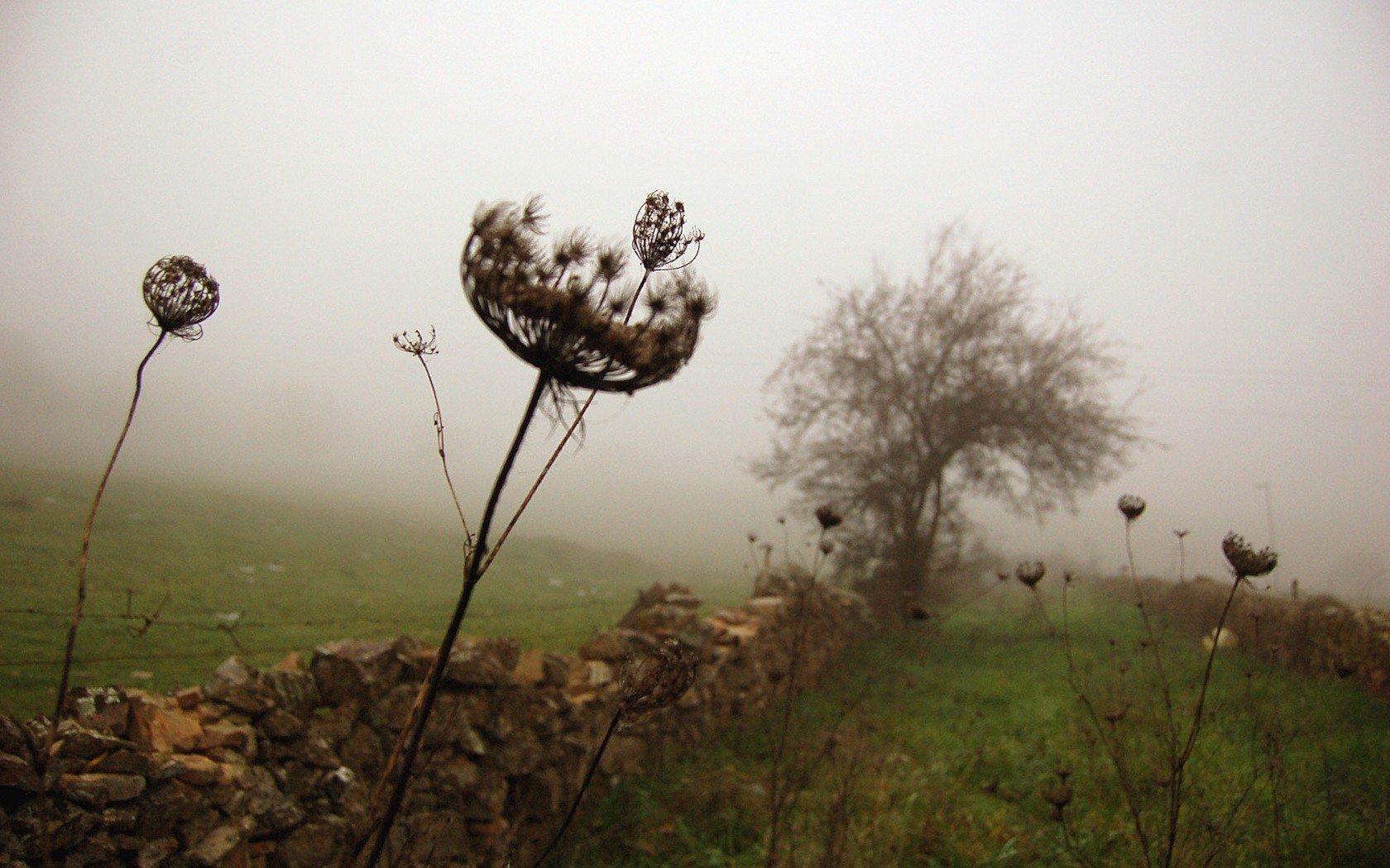 Branches vertes d'une forêt dense dans une brume brumeuseBranches vertes d'une forêt dense dans une brume brumeuse