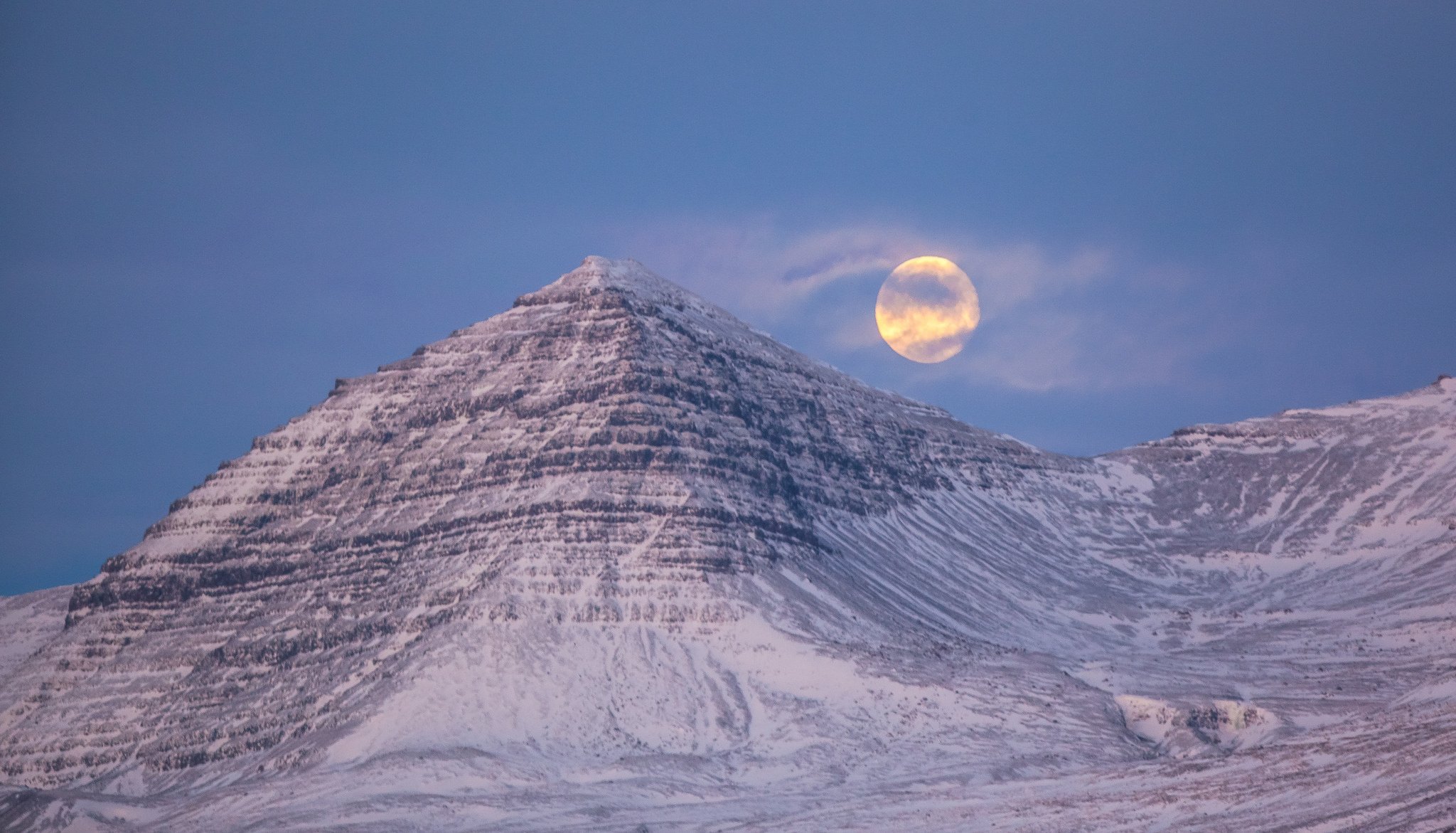 Pleine lune dans les montagnes avec la brume en Islande