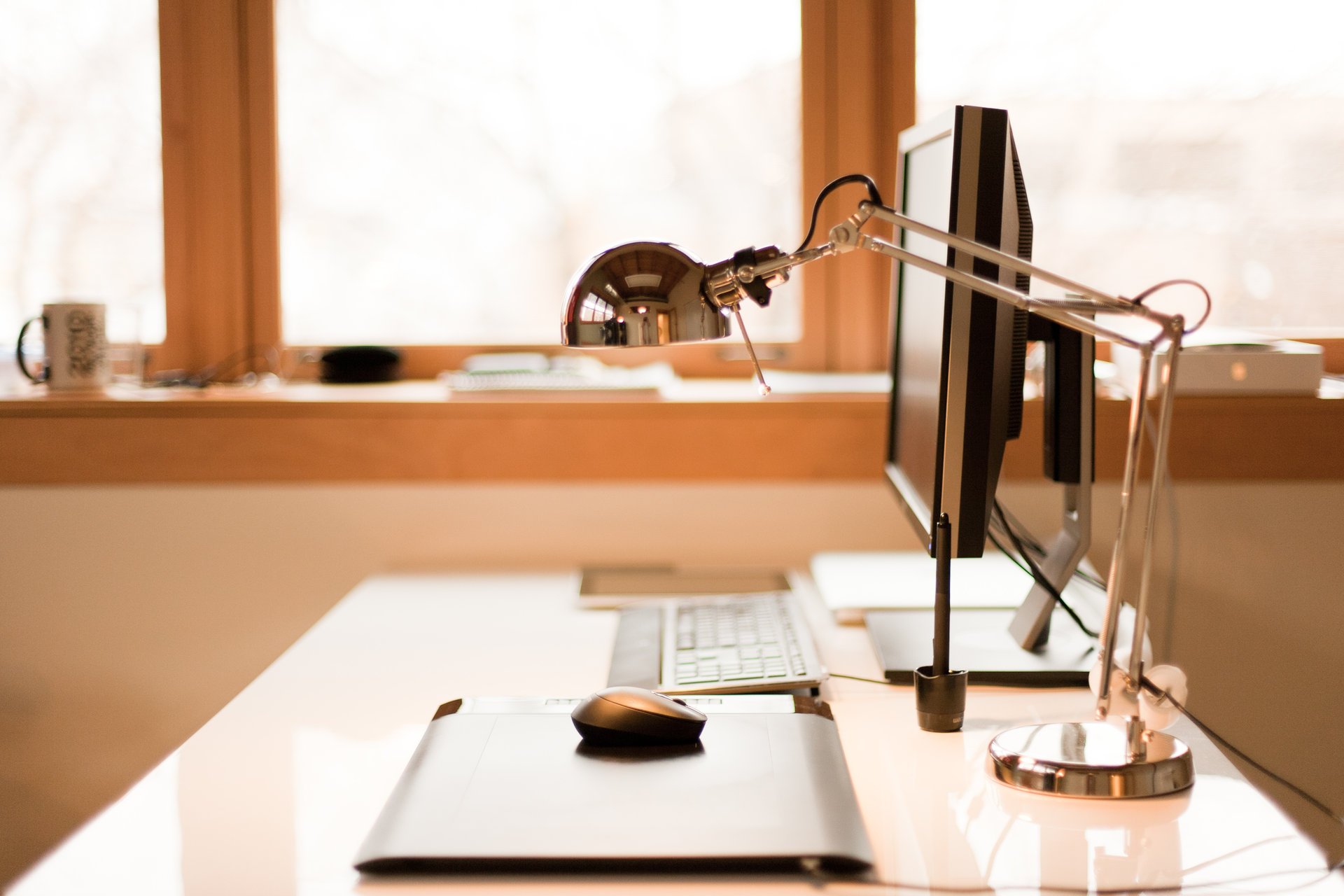 Intérieur du bureau du chef en bleu avec vue panoramique sur la forêt et la rivièreIntérieur du bureau du chef en bleu avec vue panoramique sur la forêt et la rivière