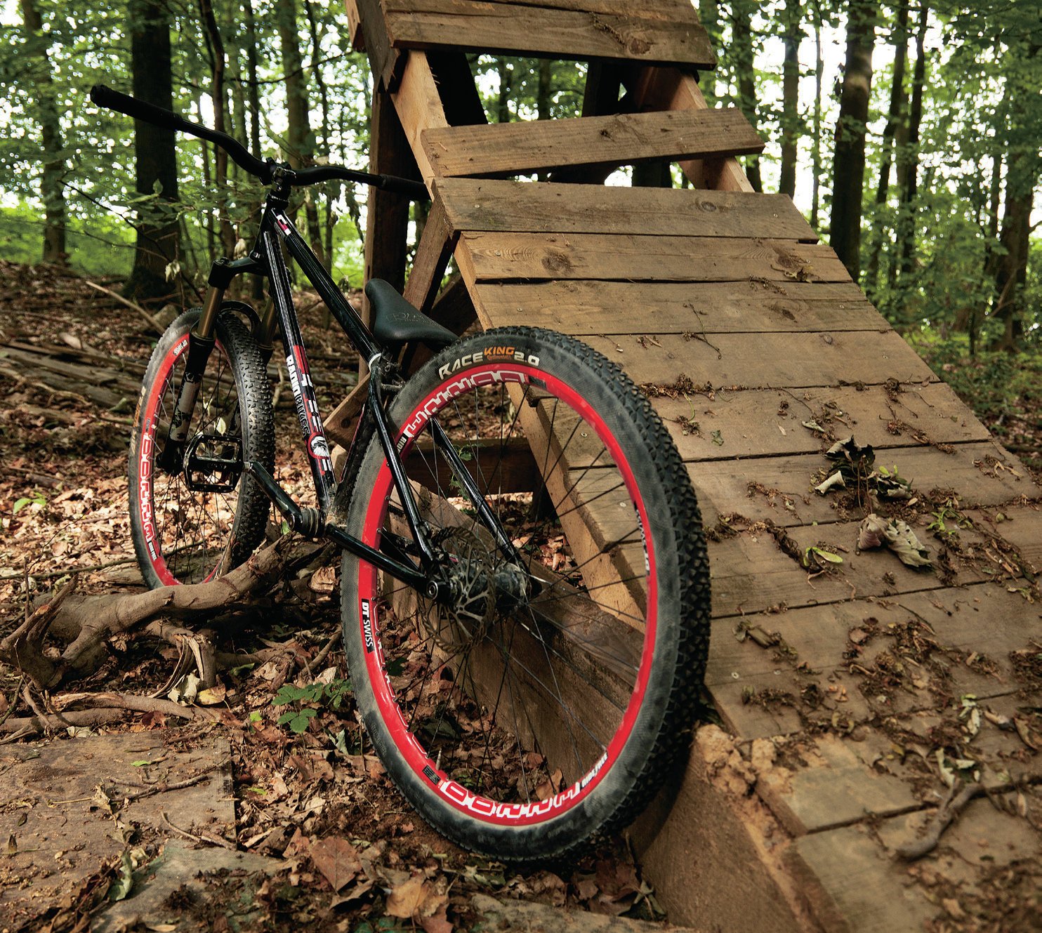 Vélo de rue dans la forêt appuyé contre une rampe cassée pour sauter