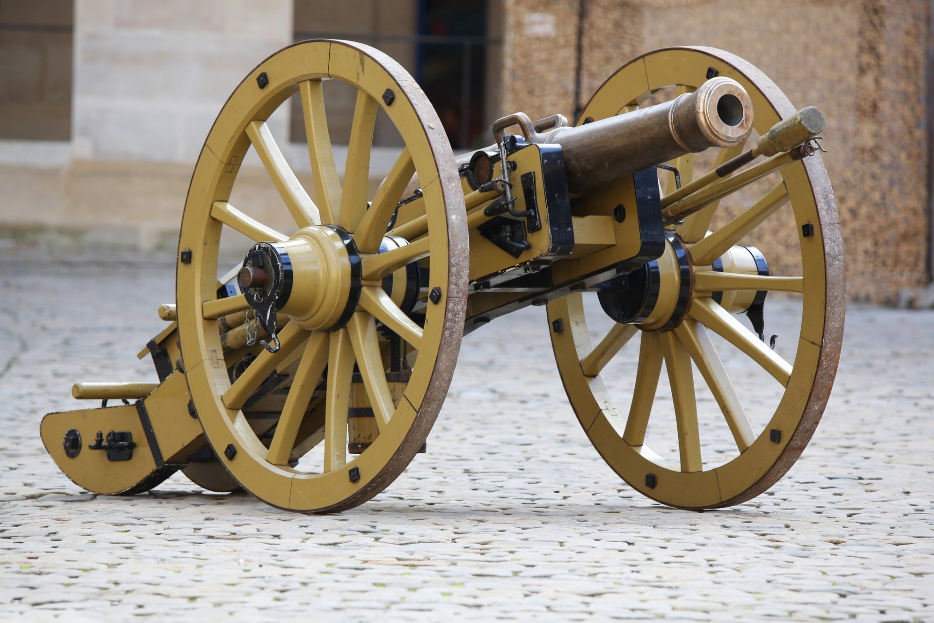 Canon d'artillerie se dresse sur le fond d'un bâtimentCanon d'artillerie se dresse sur le fond d'un bâtiment