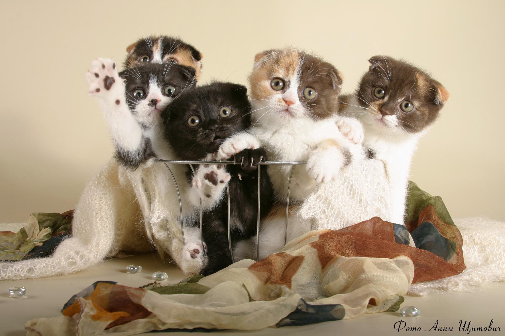 Chatons multicolores dans un panier avec un mouchoirChatons multicolores dans un panier avec un mouchoir
