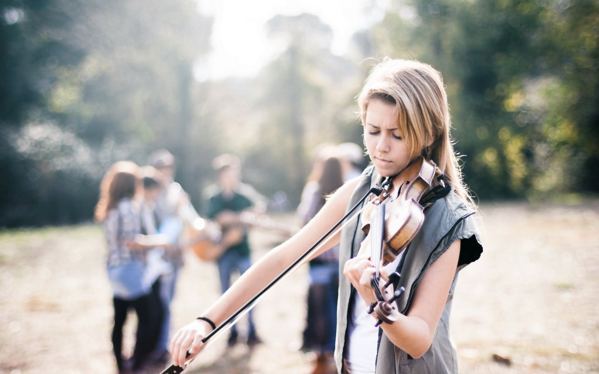 Fille adulte jouant du violon sur fond de gens