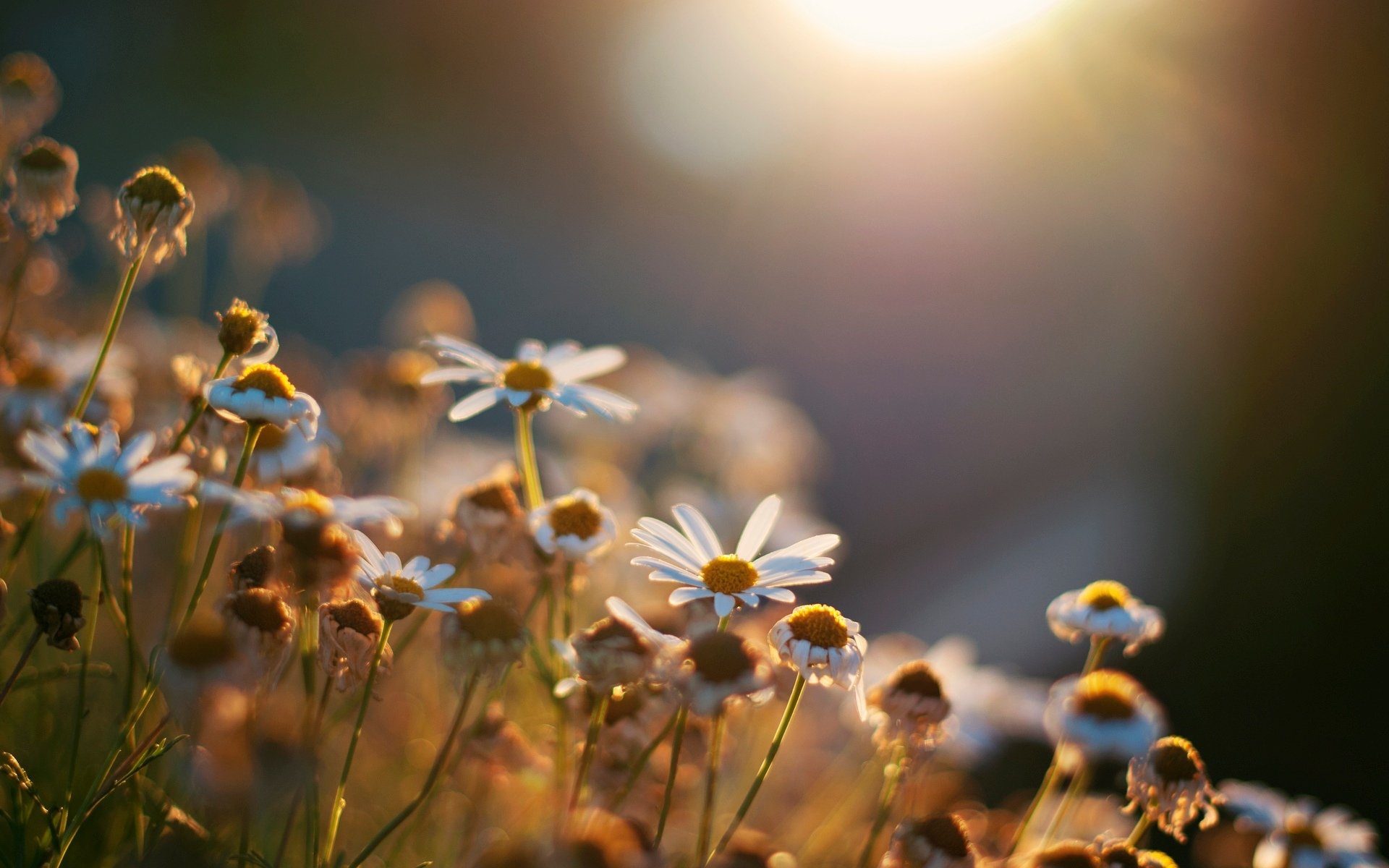 Le chien sur le champ de fleurs regarde en avant inspiré