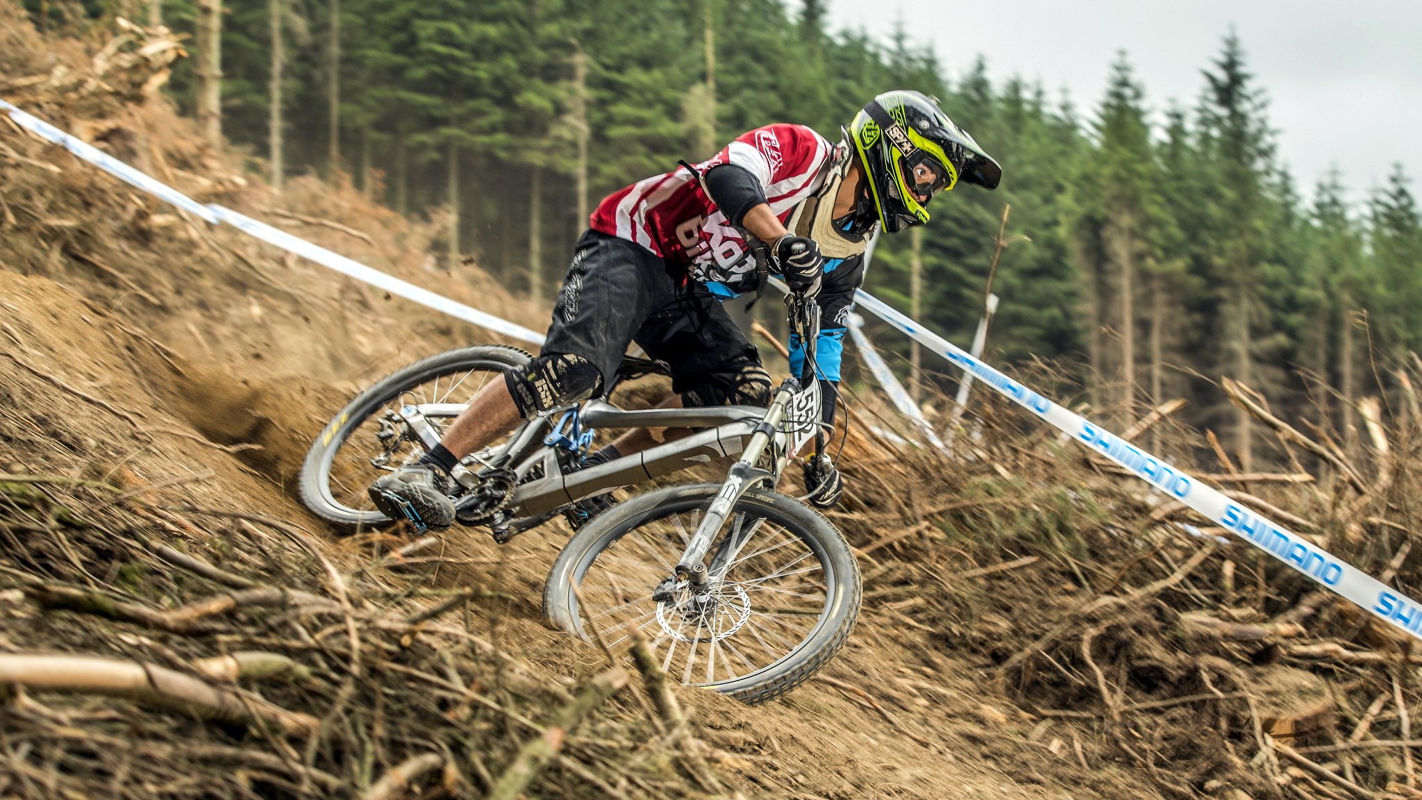 Avion double britannique sur fond de forêt et de champsAvion double britannique sur fond de forêt et de champs