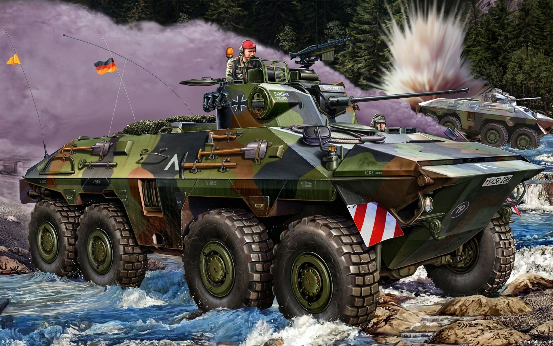 Véhicule de combat allemand peint d'infanterie au combat avec un soldat dans un béret rougeVéhicule de combat allemand peint d'infanterie au combat avec un soldat dans un béret rouge