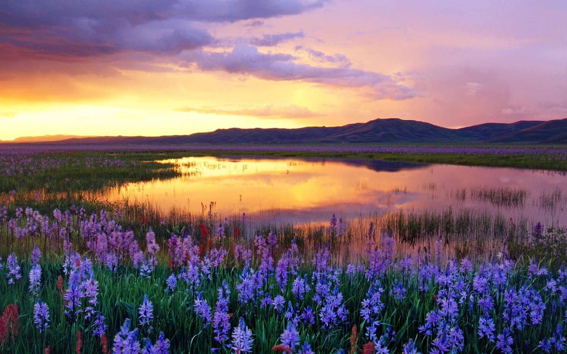 Fleurs bleues et plan d'eau avec le reflet du coucher du soleilFleurs bleues et plan d'eau avec le reflet du coucher du soleil