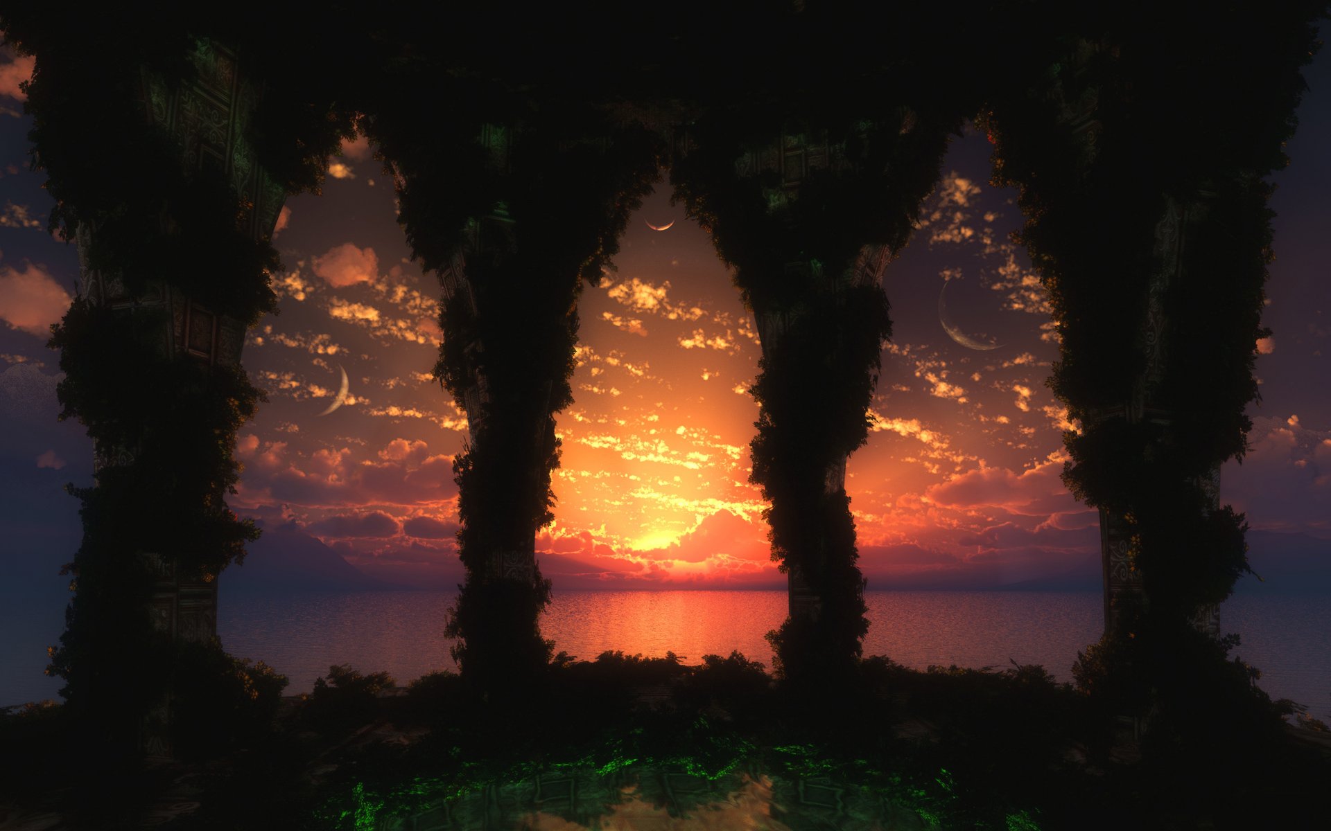 Coucher de soleil sur la mer près de quatuor des arbresCoucher de soleil sur la mer près de quatuor des arbres