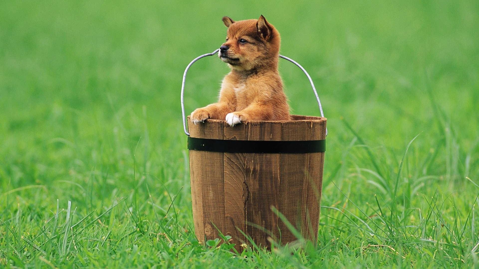 Chiot sur une clairière verte est assis dans un seauChiot sur une clairière verte est assis dans un seau