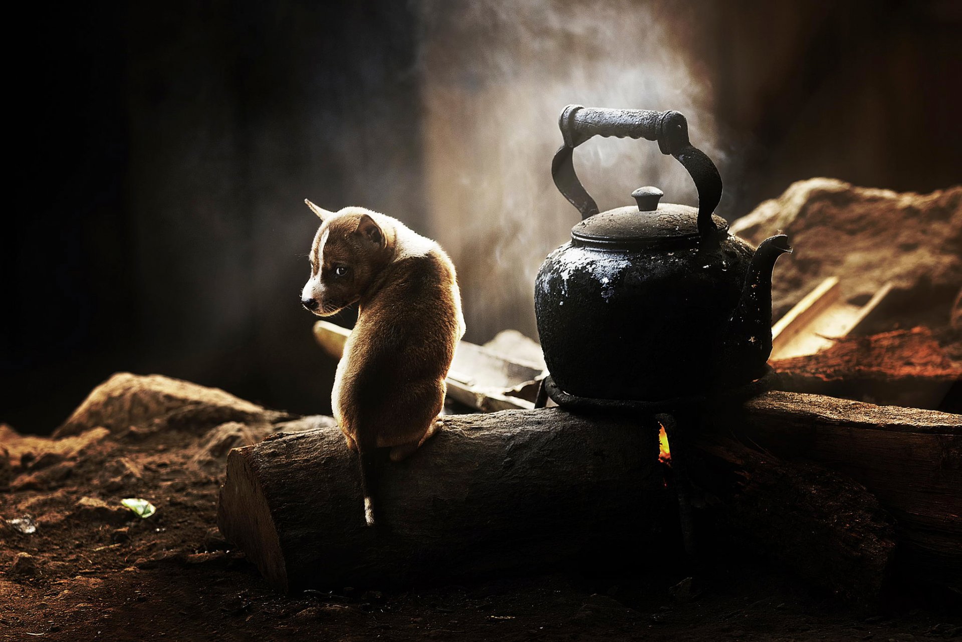 Chiot assis et garde la bouilloire