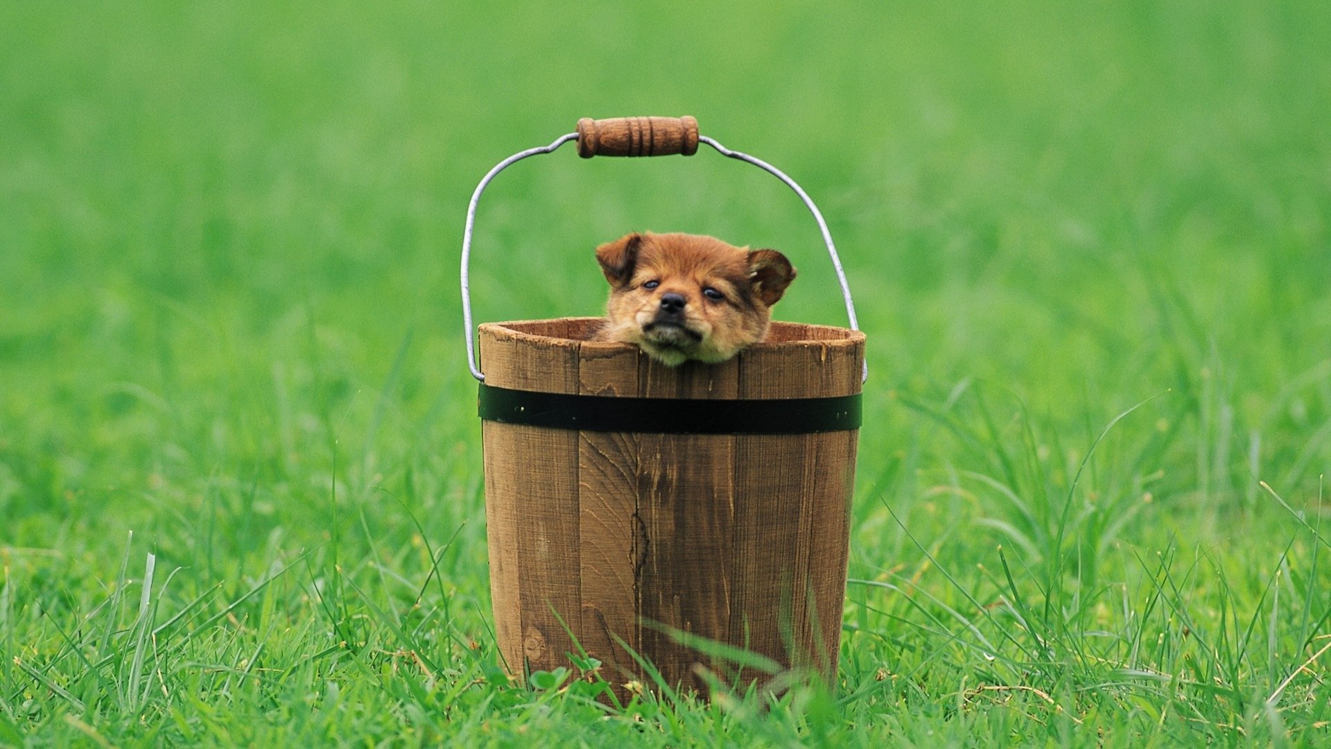 Chiot sur une clairière verte est assis dans un seauChiot sur une clairière verte est assis dans un seau