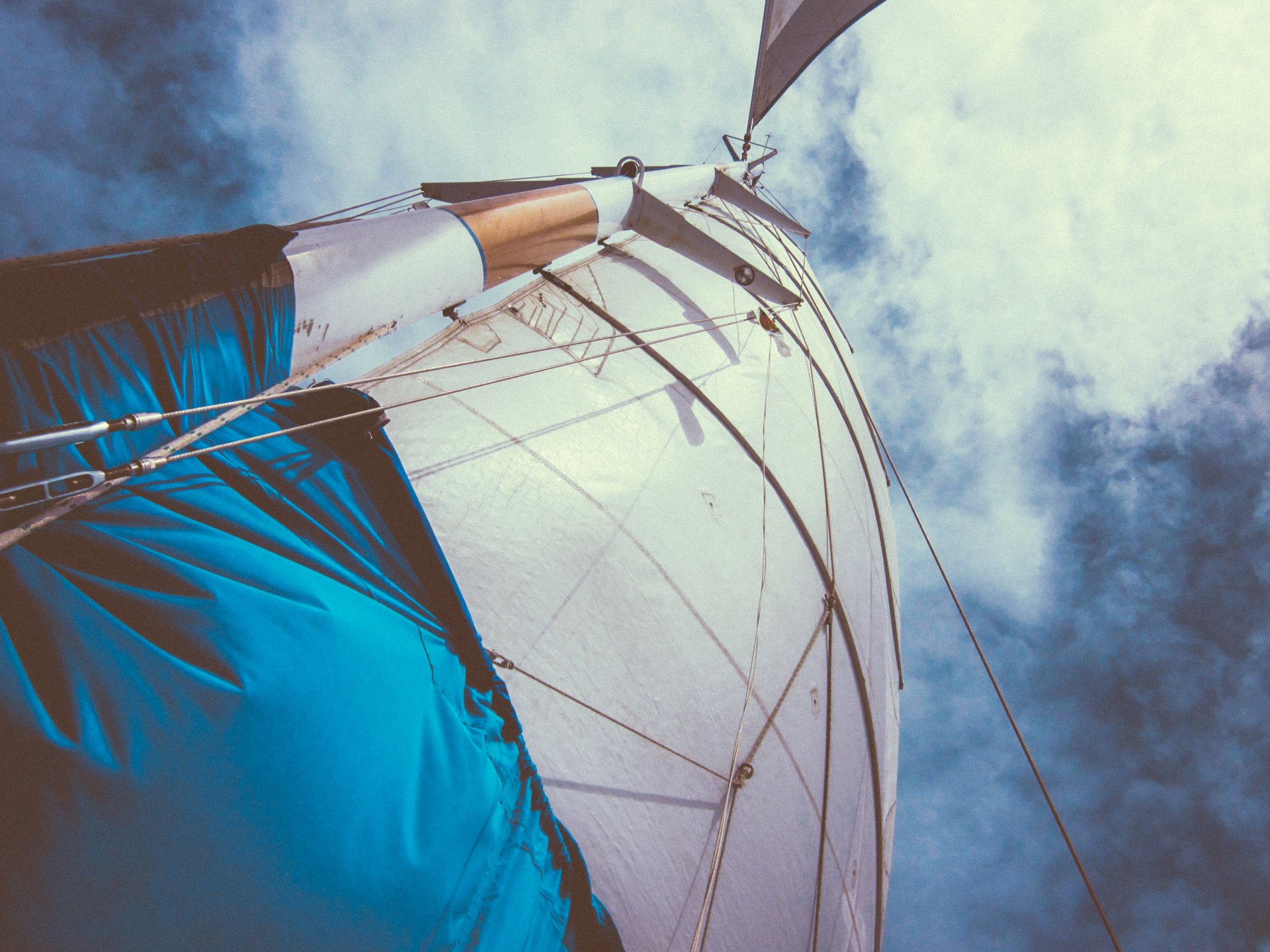 Vue d'un bateau avec une voile blanche sur un fond de ciel du soir à travers une arche