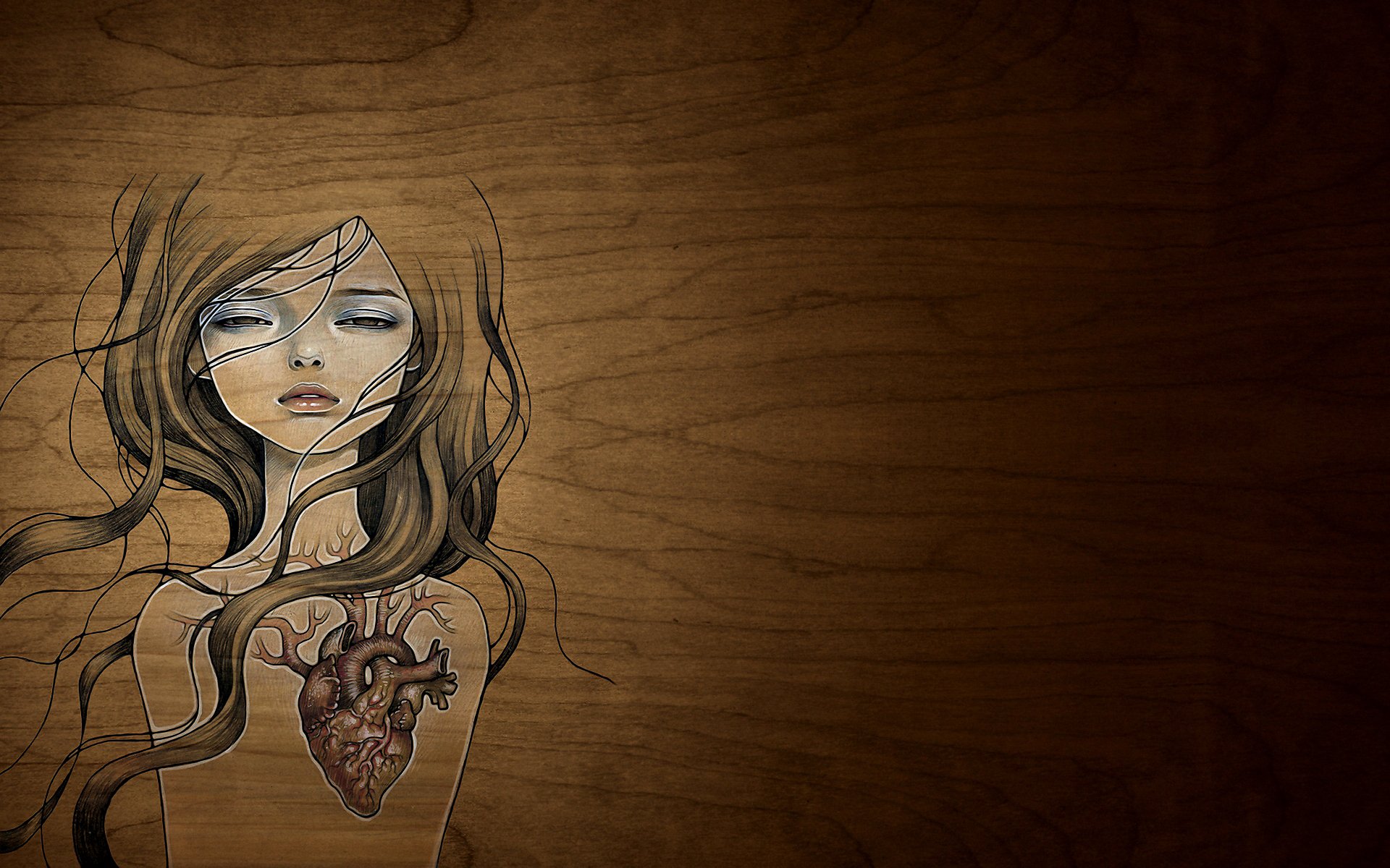 Dessin d'une jeune fille avec un coeur sur fond de texture de boisDessin d'une jeune fille avec un coeur sur fond de texture de bois
