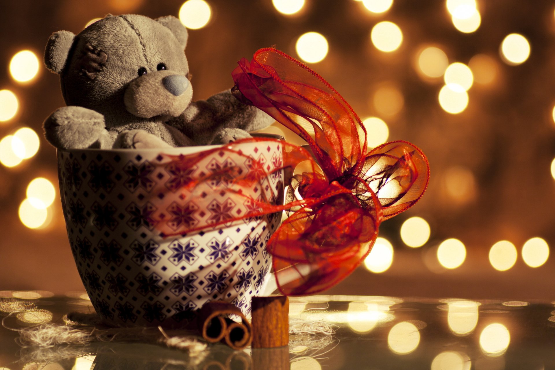 Ours en peluche emballé dans un pot avec un ruban cadeau rougeOurs en peluche emballé dans un pot avec un ruban cadeau rouge