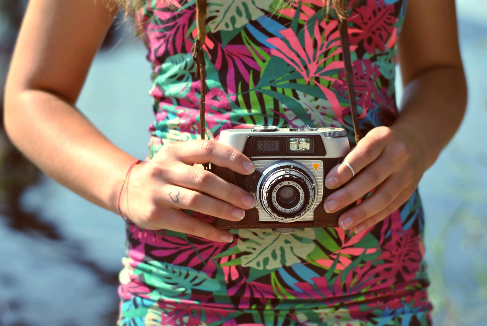 Vieux appareil photo avec une sangle dans les mains de la jeune fille