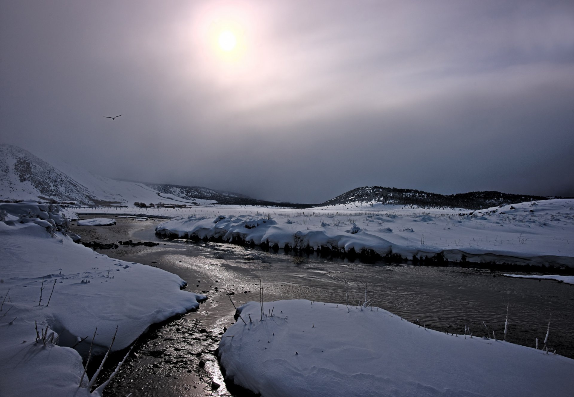 Rivière de montagne qui coule autour de la forêt enneigée passé d'énormes montagnesRivière de montagne qui coule autour de la forêt enneigée passé d'énormes montagnes