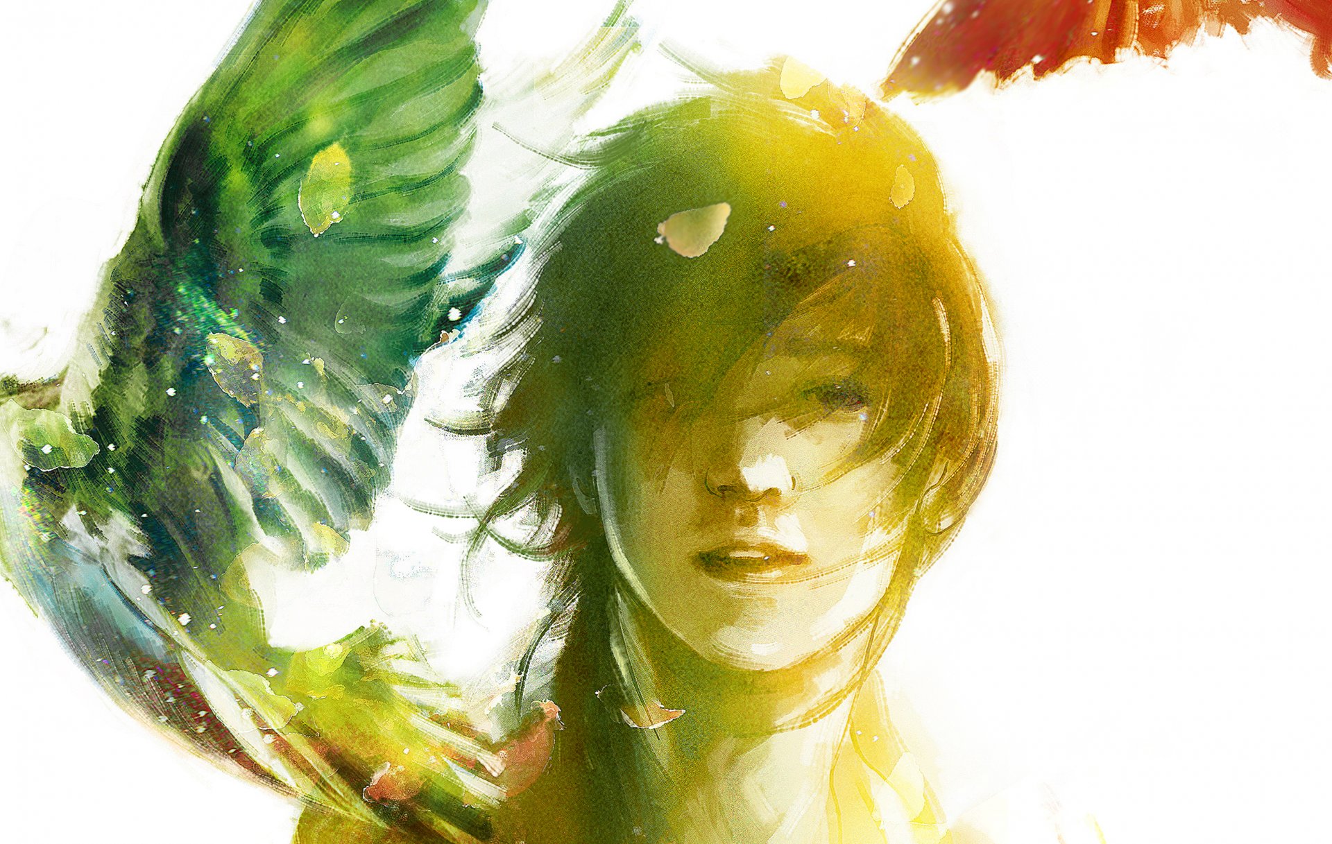 Guy avec des ailes sur fond de pétales et de l'arc-en-ciel