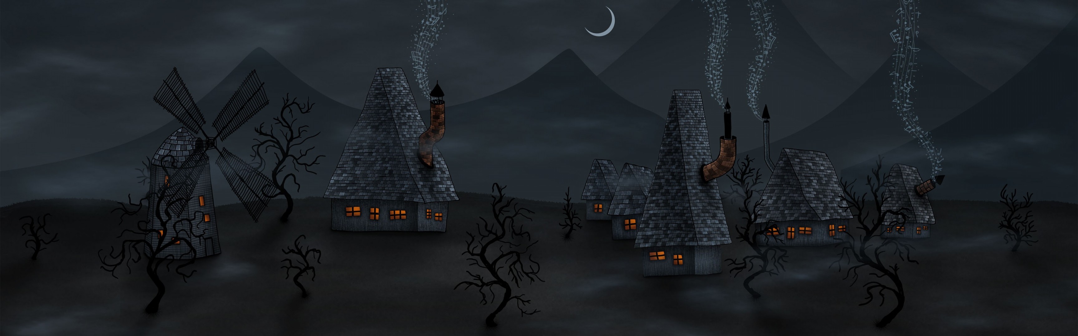Moulin dans un village de nuit peint, où la lumière brûle dans les maisons et la fumée s'enroule dans les tuyaux