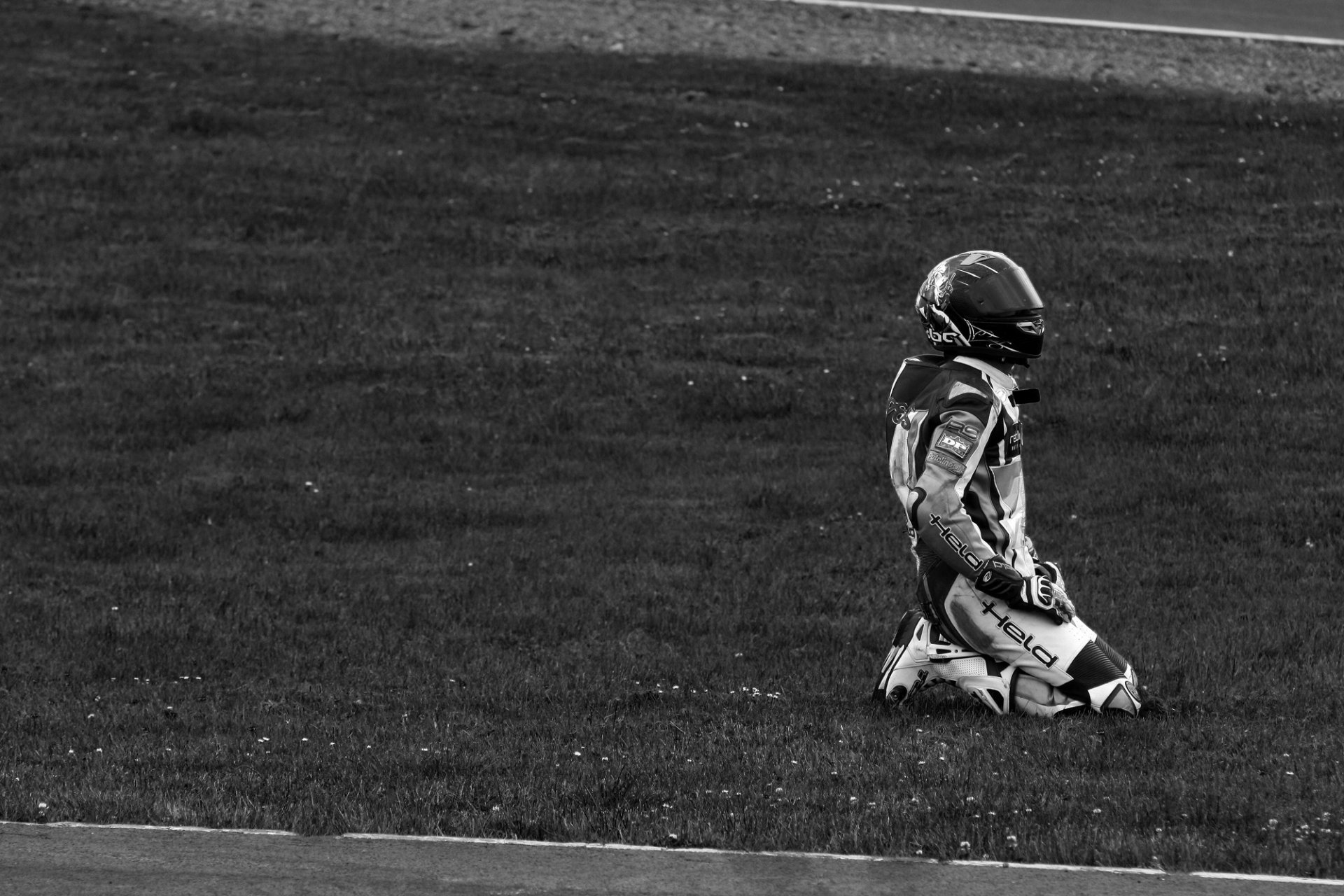 Coureur dans un casque sur ses genoux
