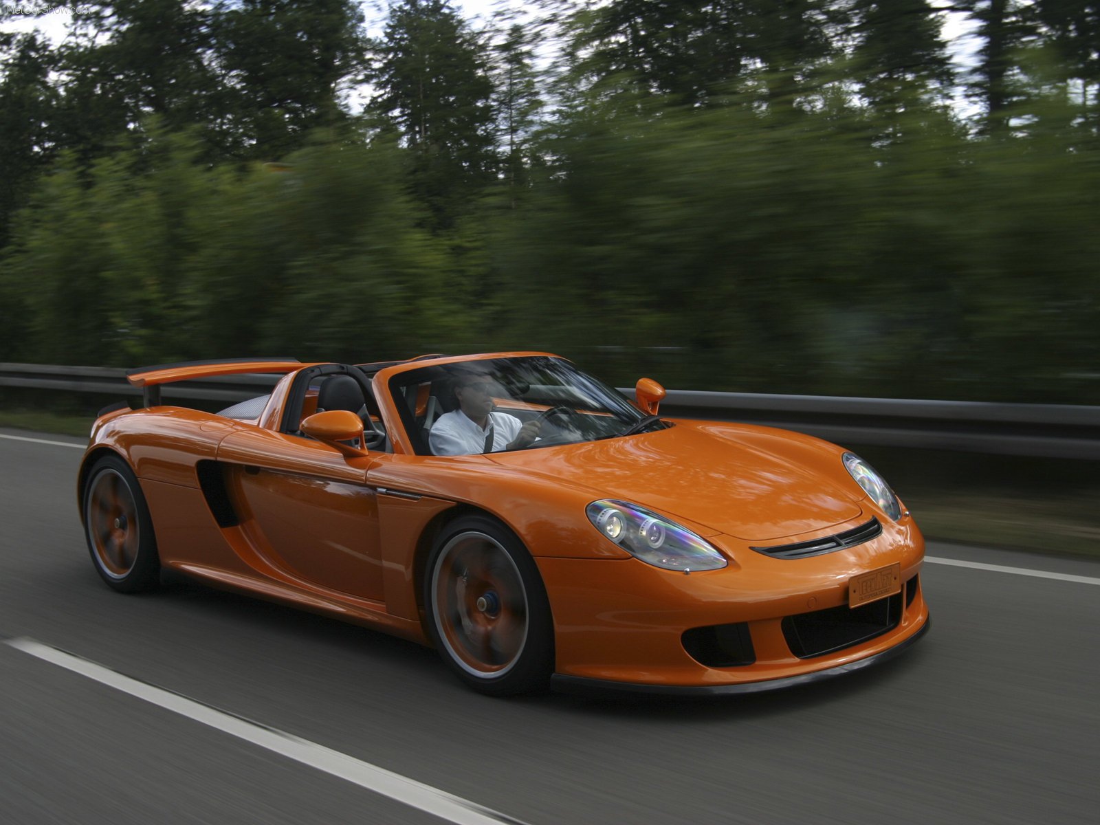 Cabriolet en mouvement sur la route sur fond de forêtCabriolet en mouvement sur la route sur fond de forêt