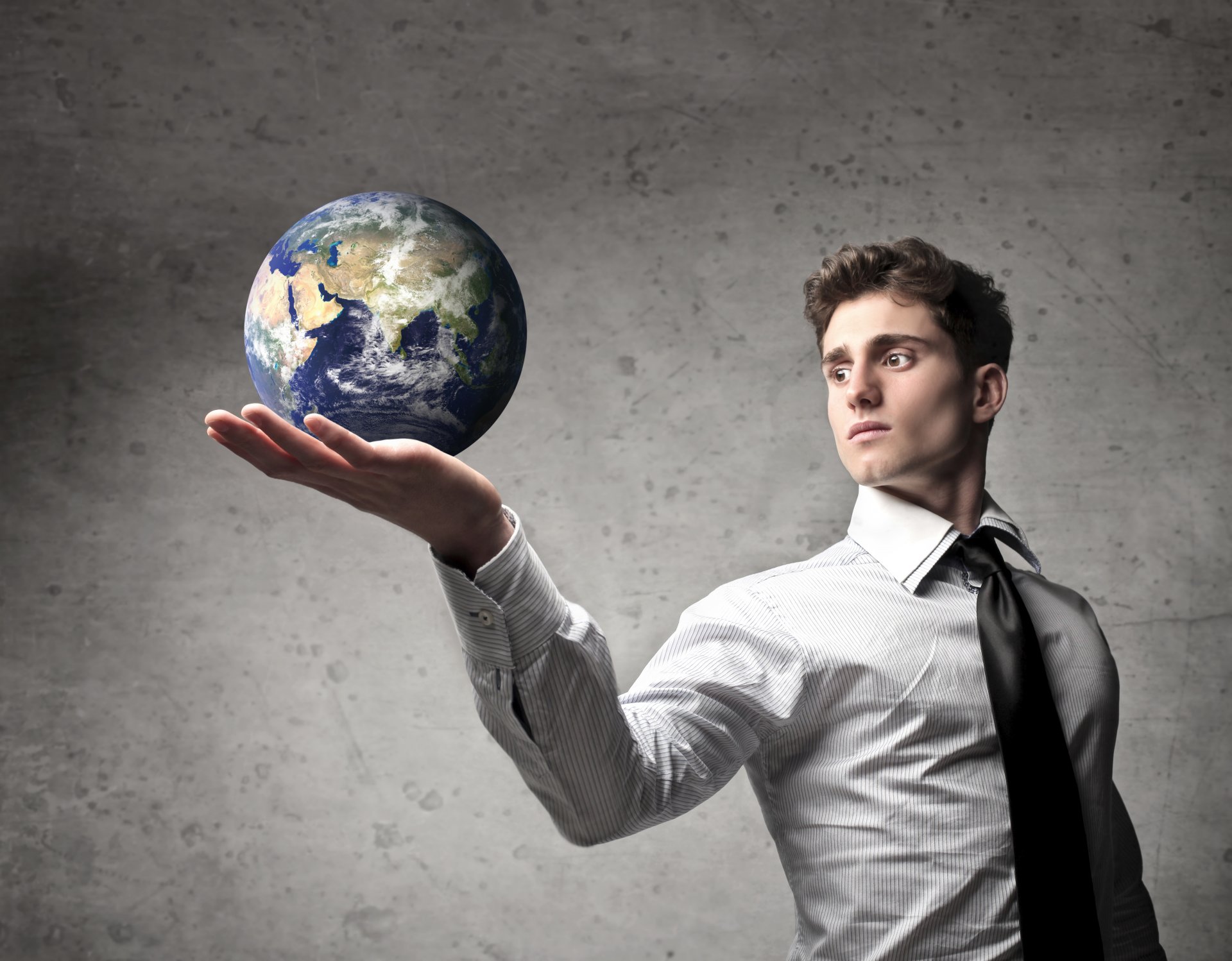 Le gars en cravate tenant le globe dans la paume de sa mainLe gars en cravate tenant le Globe dans la paume de sa main