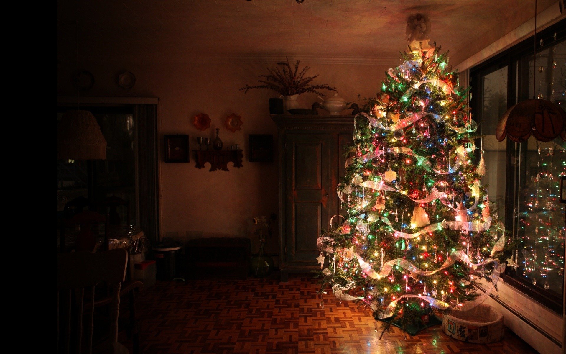 Il fait nuit. arbre de noël avec des guirlandes allumées dans l'appartementIl fait nuit. Arbre de Noël avec des guirlandes allumées dans l'appartement