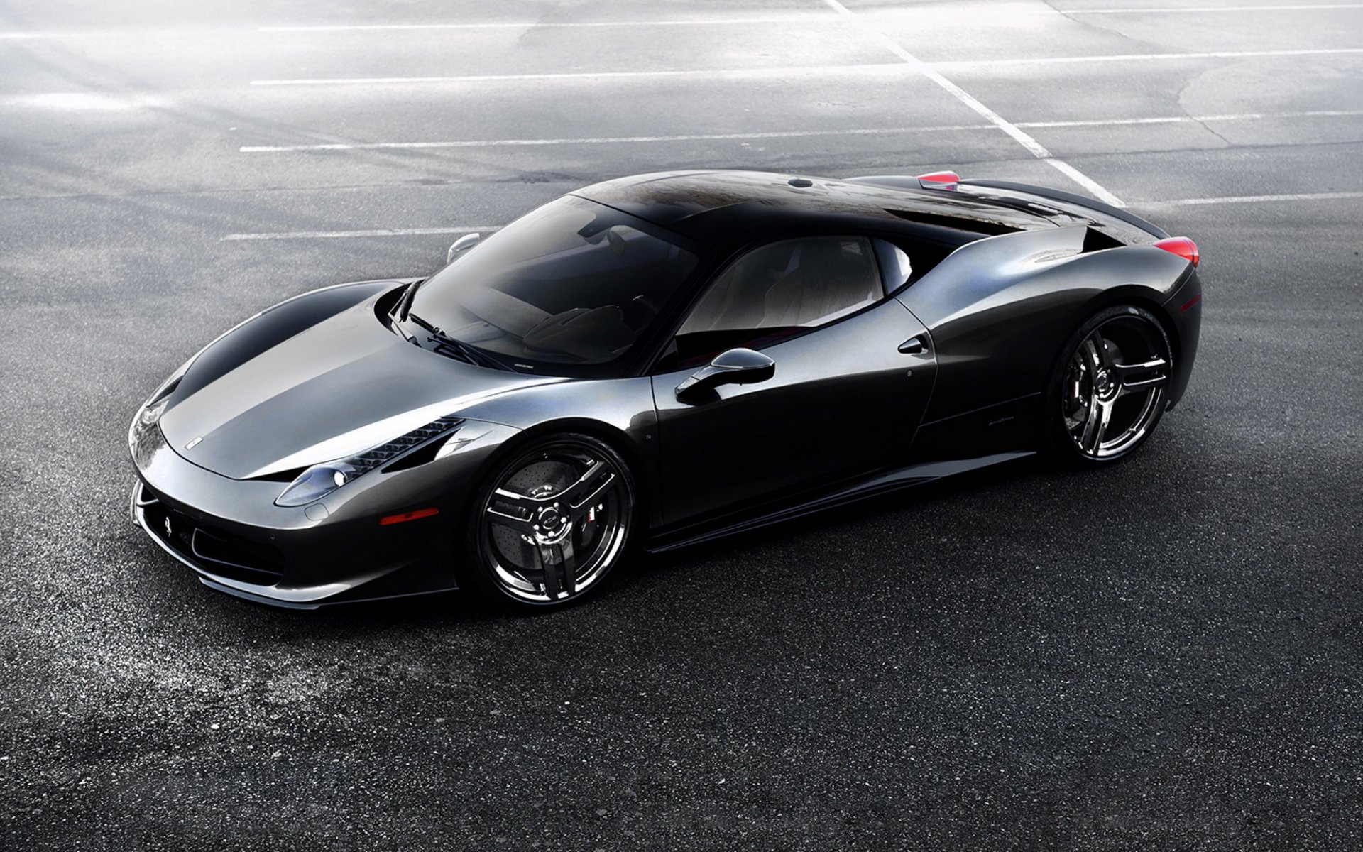 Noir supercar ferrari 458 sur l'asphalte vue latéraleNoir supercar ferrari 458 sur l'asphalte vue latérale
