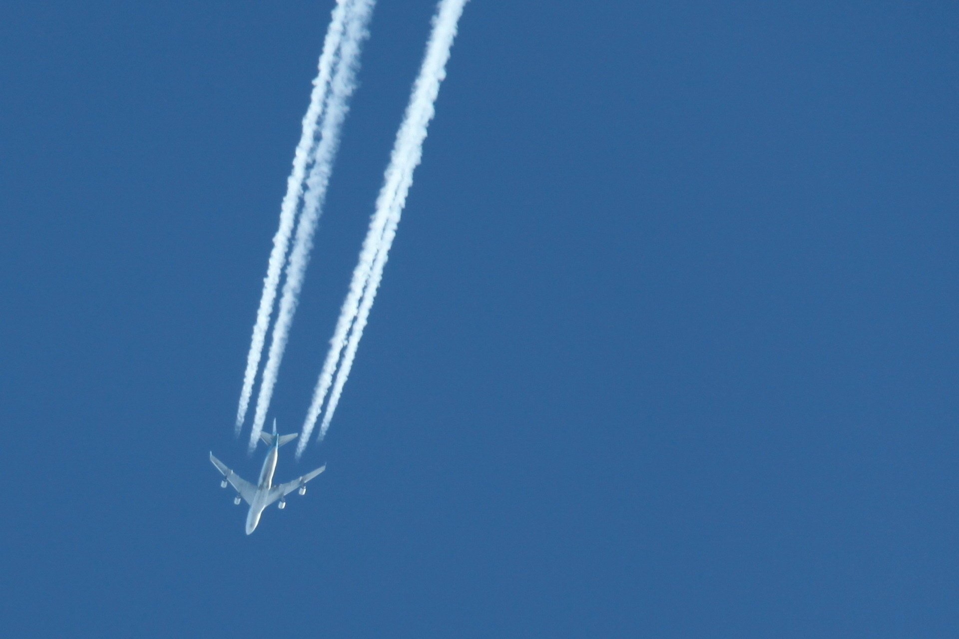 L'avion vole dans le ciel bleu laissant une trace blancheL'avion vole dans le ciel bleu laissant une trace blanche