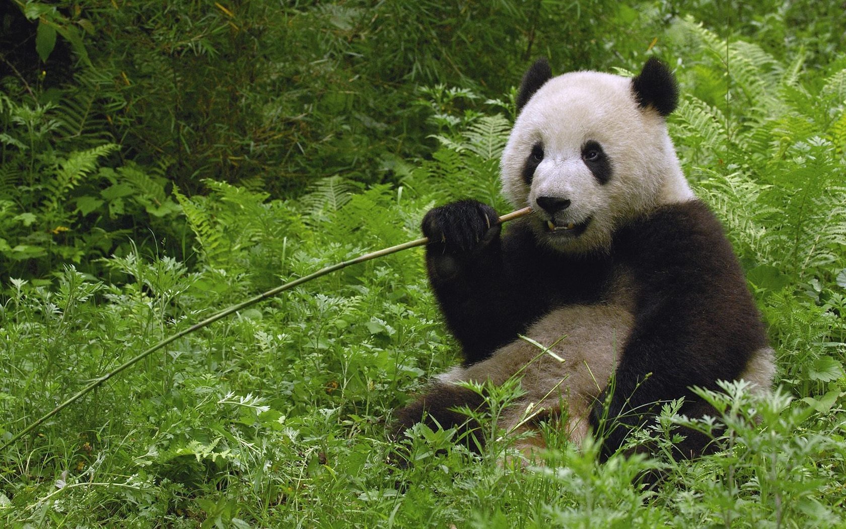 Panda vivant mange du bambou sur l'herbe verte. enimelPanda vivant mange du bambou sur l'herbe verte. Enimel