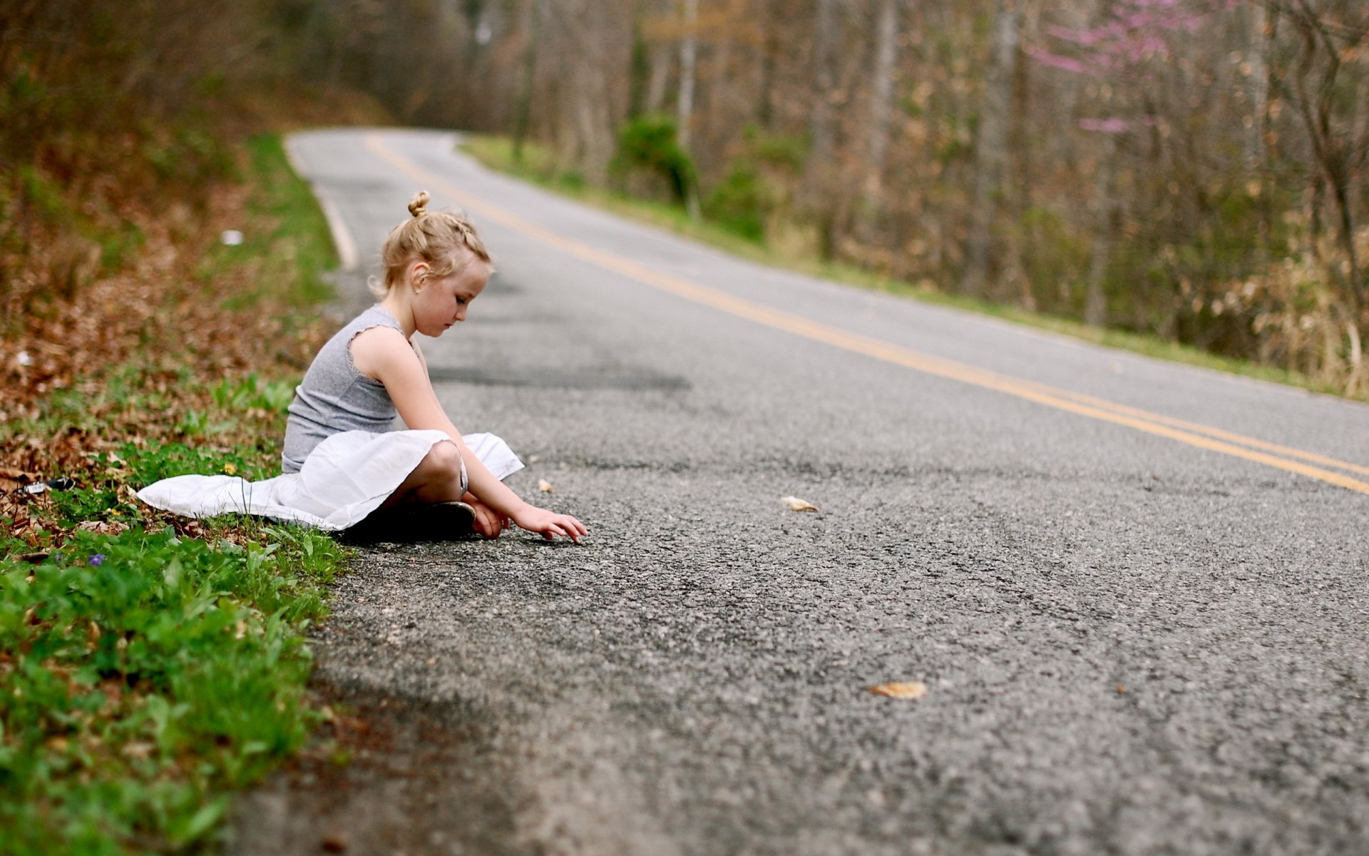 Petite fille assise sur la route dans la lumière du coucher du soleil
