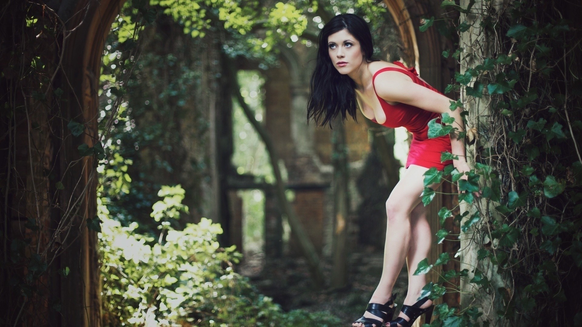 Belle géorgienne en robe rouge. brunette en robe courte sur le canapéBelle géorgienne en robe rouge. Brunette en robe courte sur le canapé