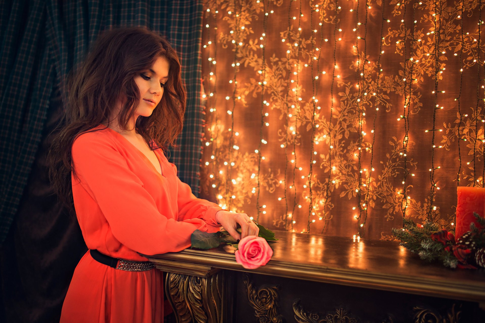 Fille en robe rouge dans la salle, image dans le style de la Renaissance