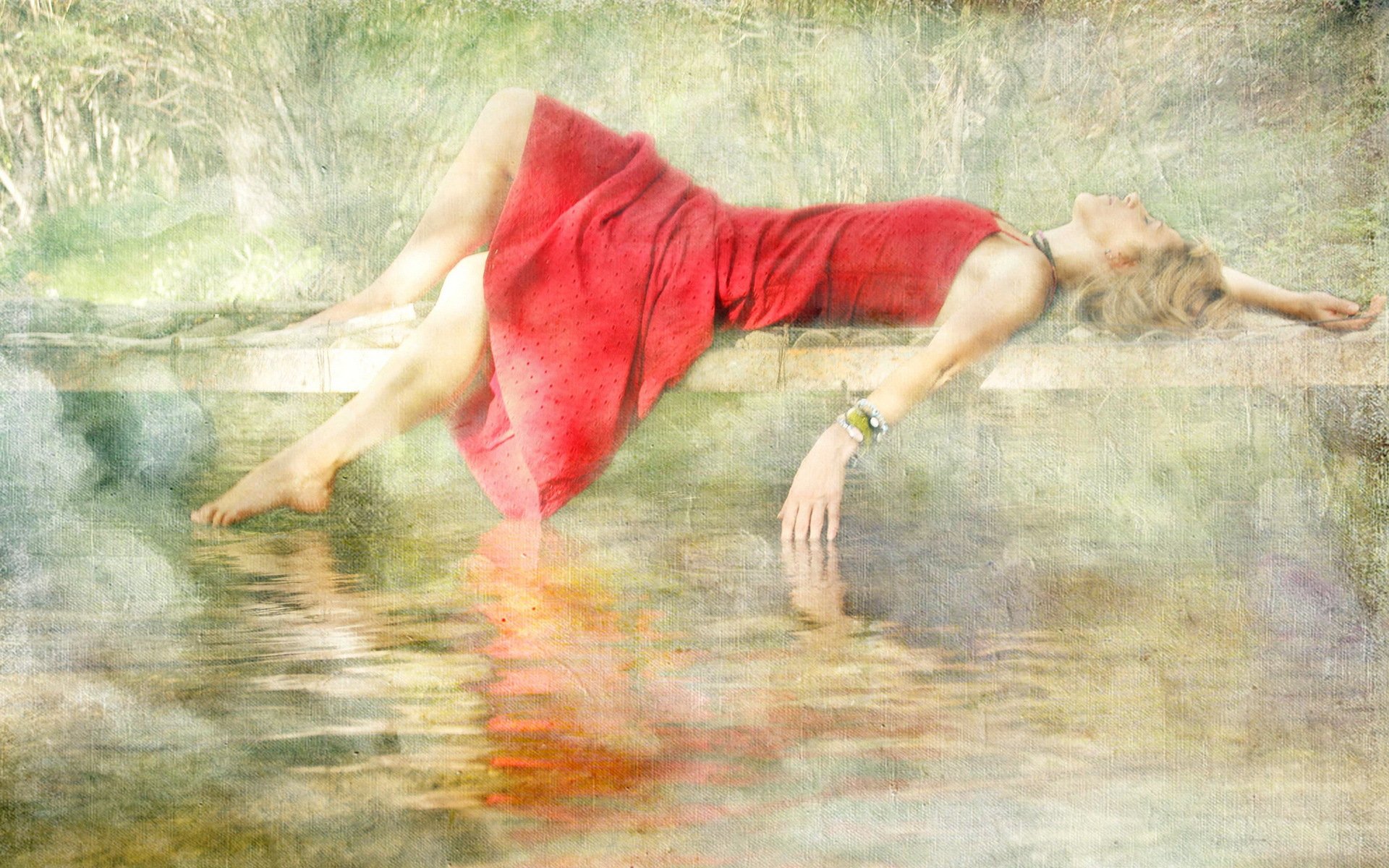 Une belle photo de la fille en robe rouge sur un bateau dans le brouillardUne belle photo de la fille en robe rouge sur un bateau dans le brouillard