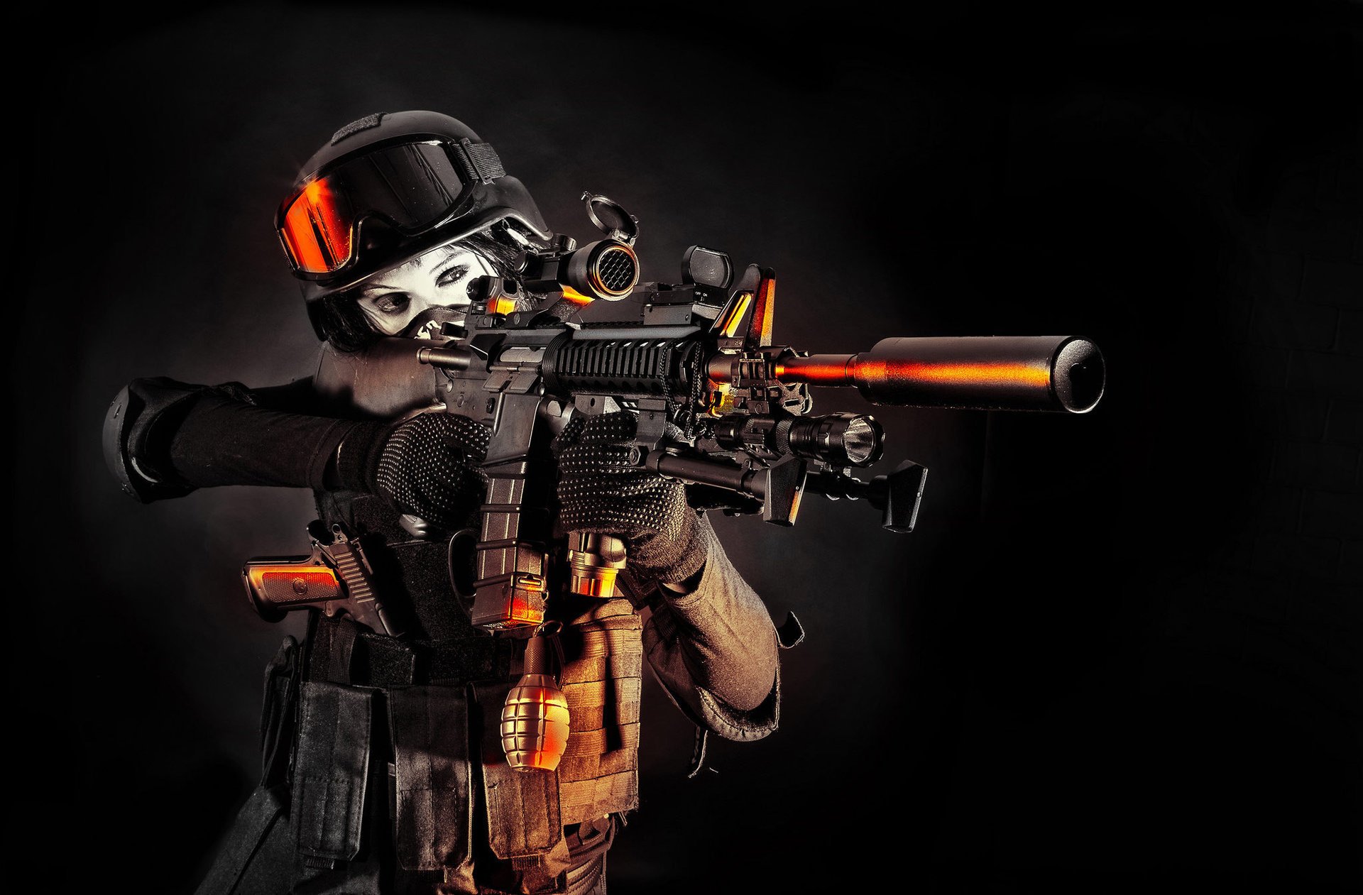 Fille en short et masque assis sur le sol avec des armes à la mainFille en short et masque assis sur le sol avec des armes à la main