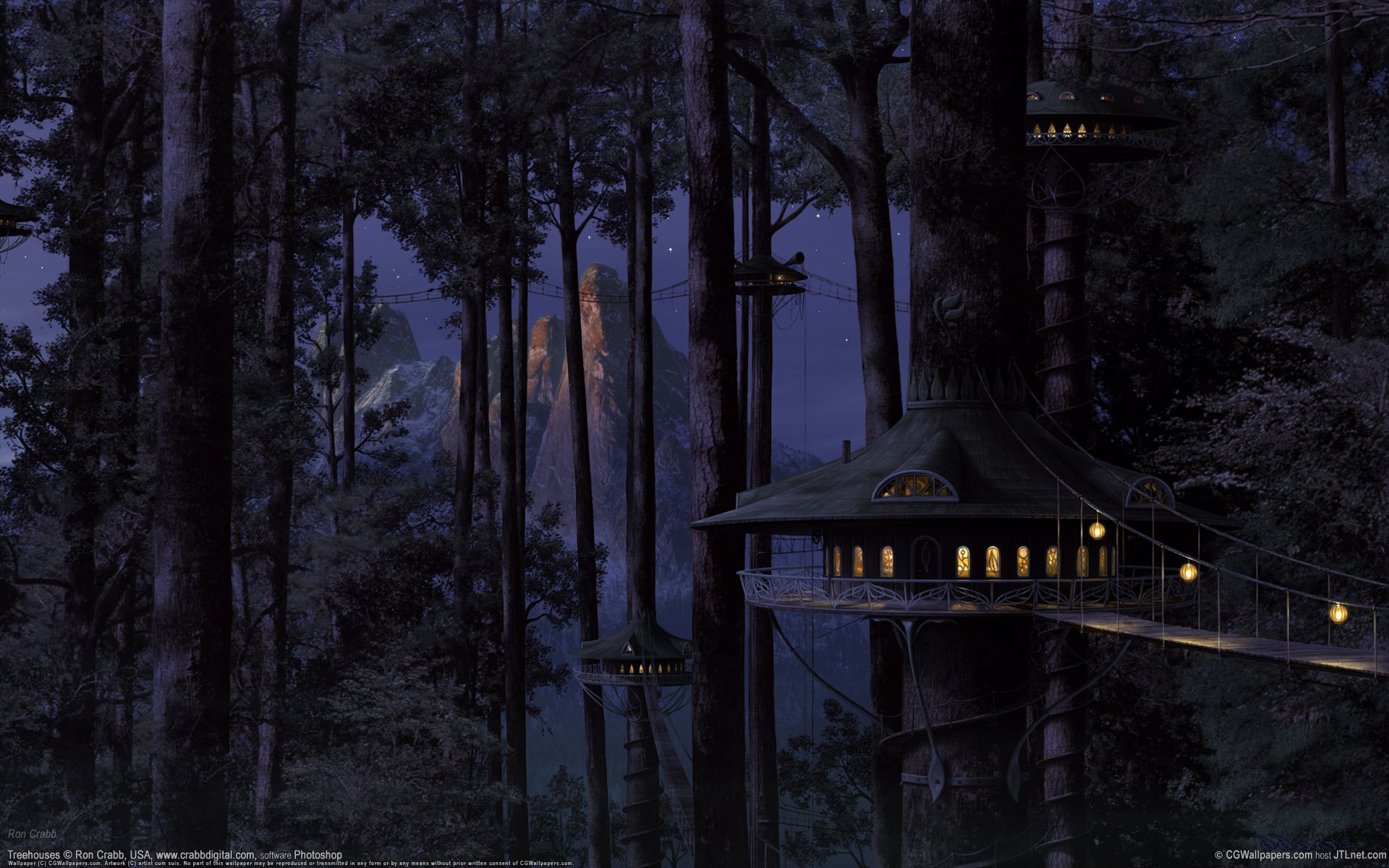 Dessin de maisons dans les arbres avec un pont dans le style de la fantaisieDessin de maisons dans les arbres avec un pont dans le style de la fantaisie