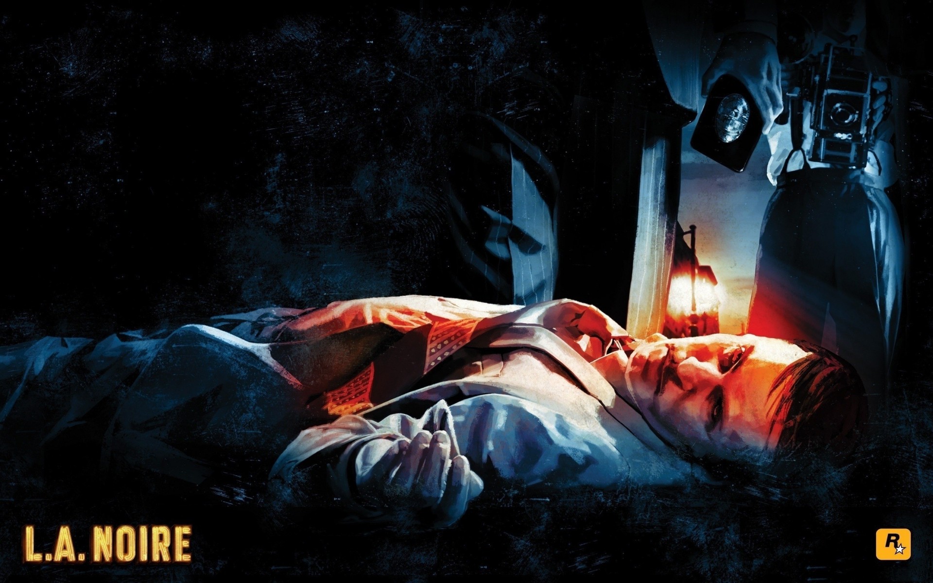 Affiche du jeu l. a. noire de la société de jeux rockstar games avec un cadavre couchéAffiche du jeu L. A. Noire de la société de jeux Rockstar Games avec un cadavre couché
