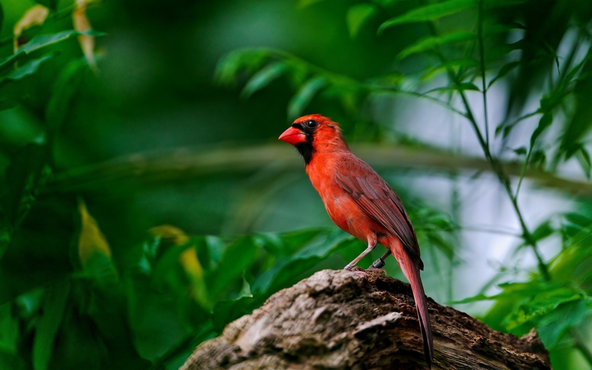 Au milieu du feuillage, un oiseau rouge se trouve sur une brancheAu milieu du feuillage, un oiseau rouge se trouve sur une branche