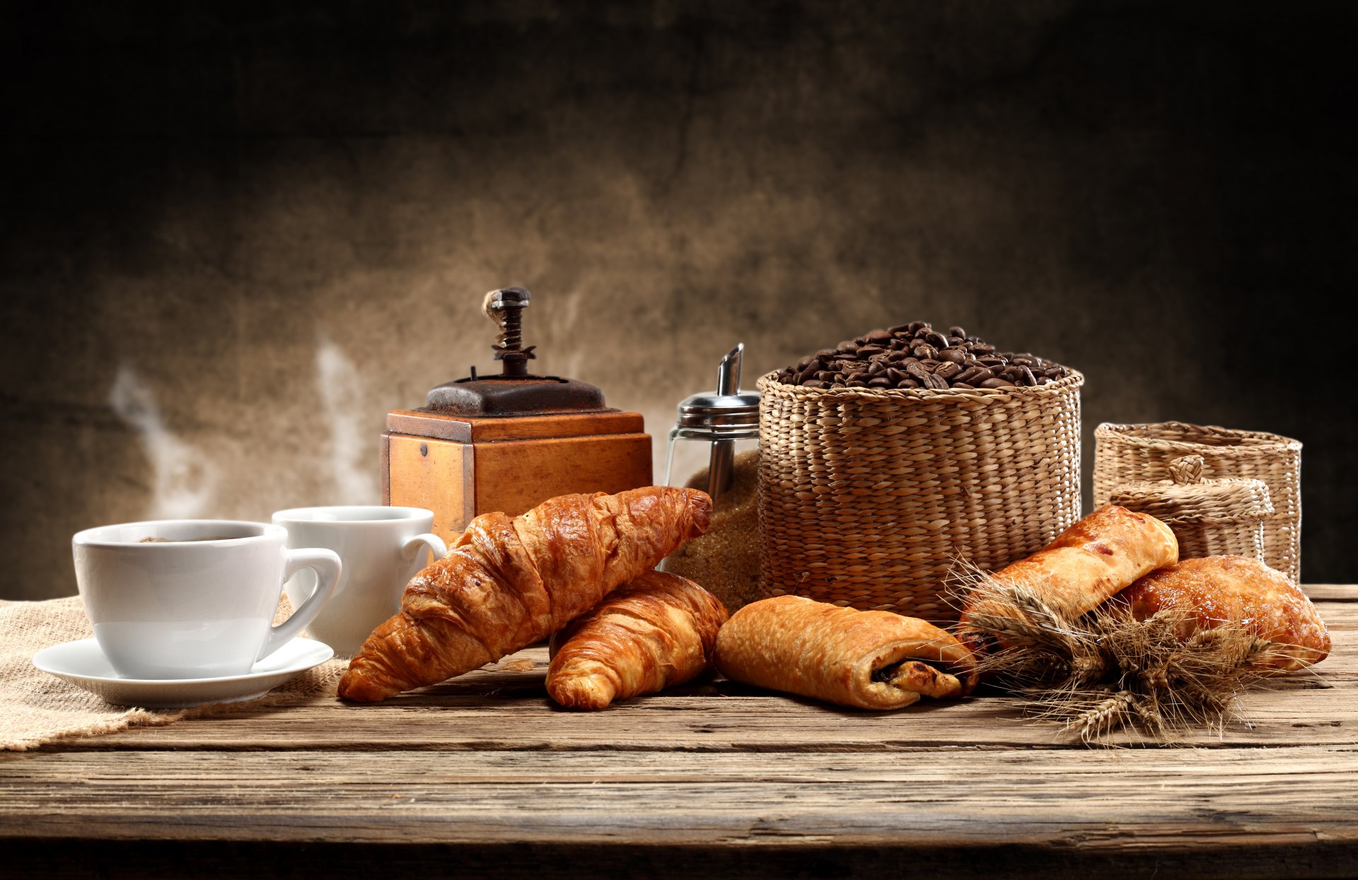 Pain frais à la table avec une tasse de café faite dans un moulin à café