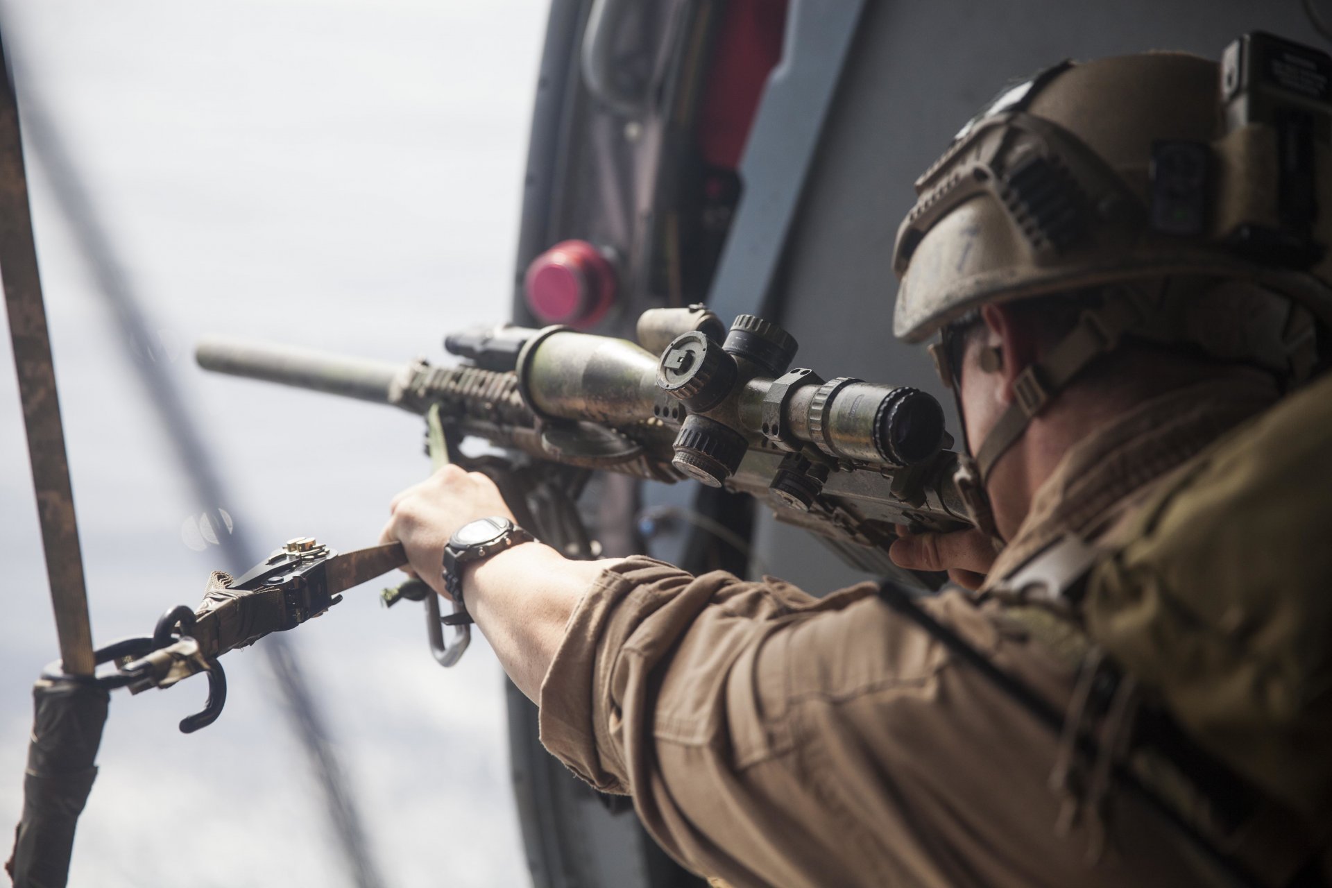 Soldat dans un casque avec un fusil de sniper dans les mains