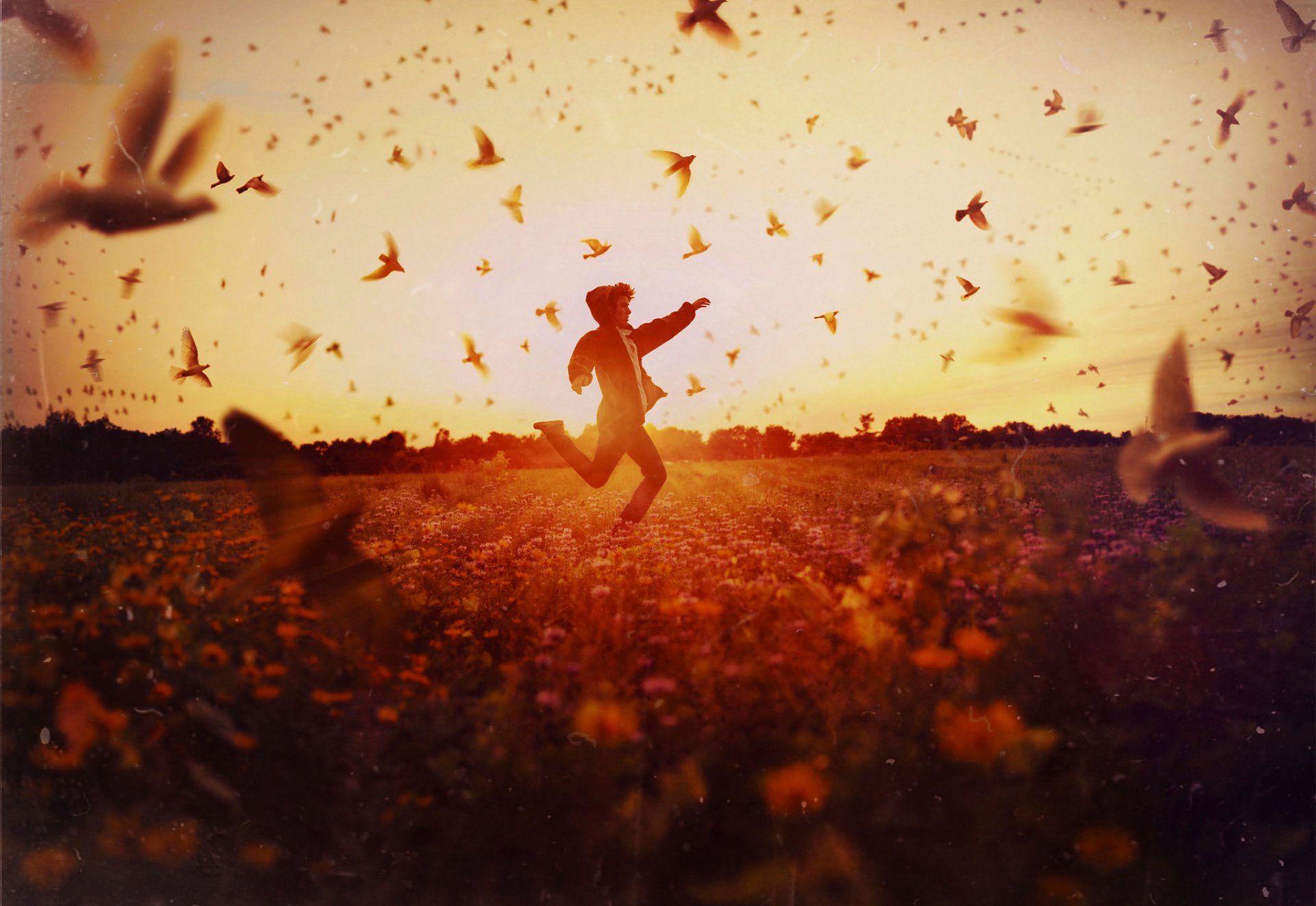 Le gars, éclairé par le soleil, court sur le terrain dispersant les oiseaux