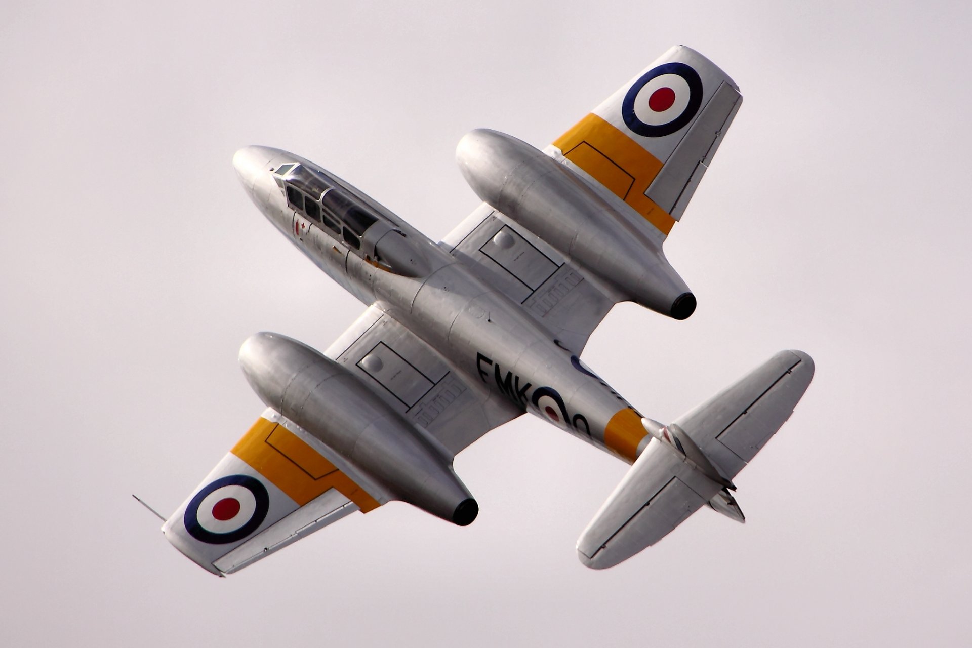Dessin d'un biplan Britannique volant au-dessus des maisons