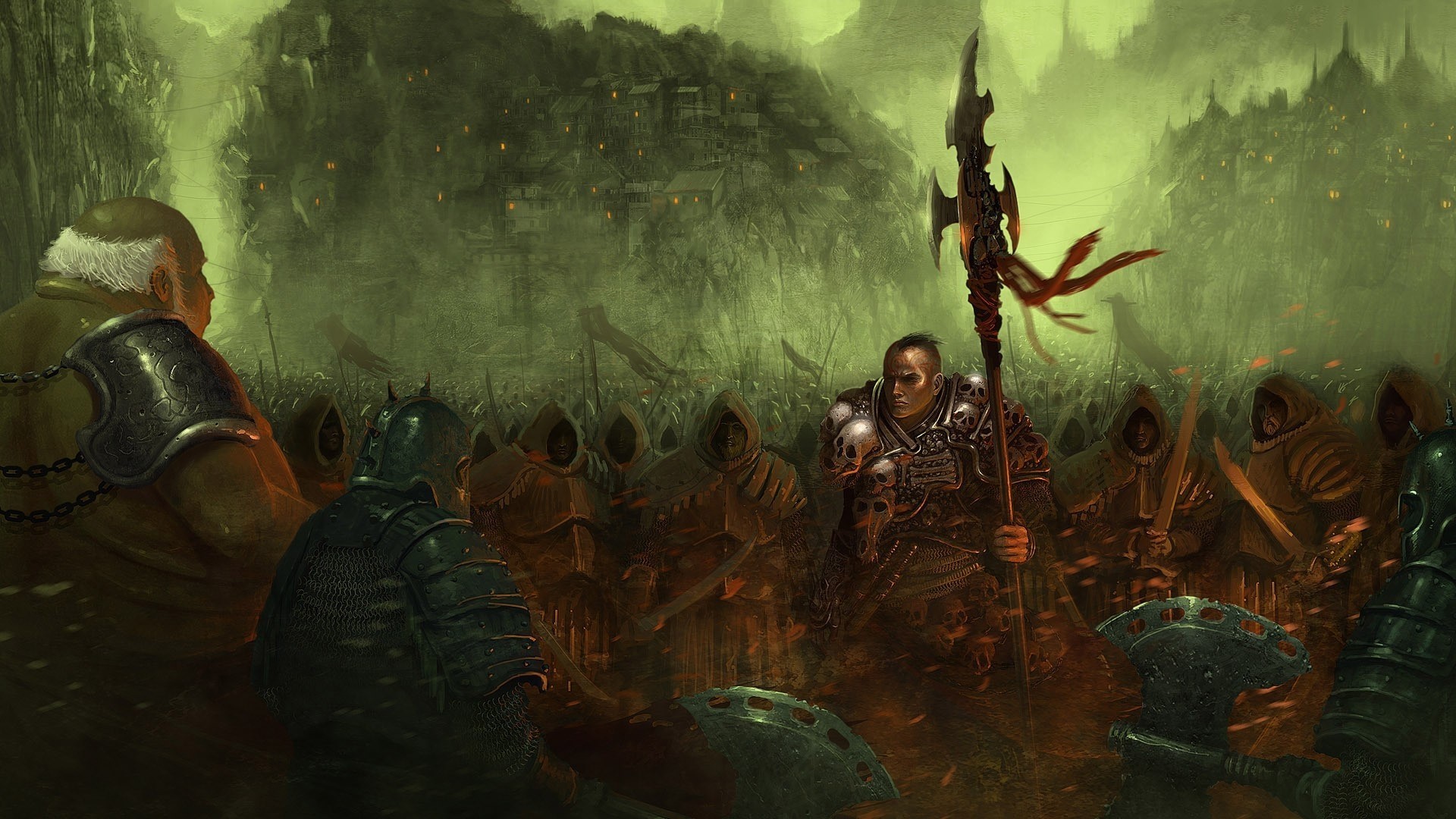 Mage sur le champ de bataille avec le dragon et les guerriers sur le terrainMage sur le champ de bataille avec le dragon et les guerriers sur le terrain
