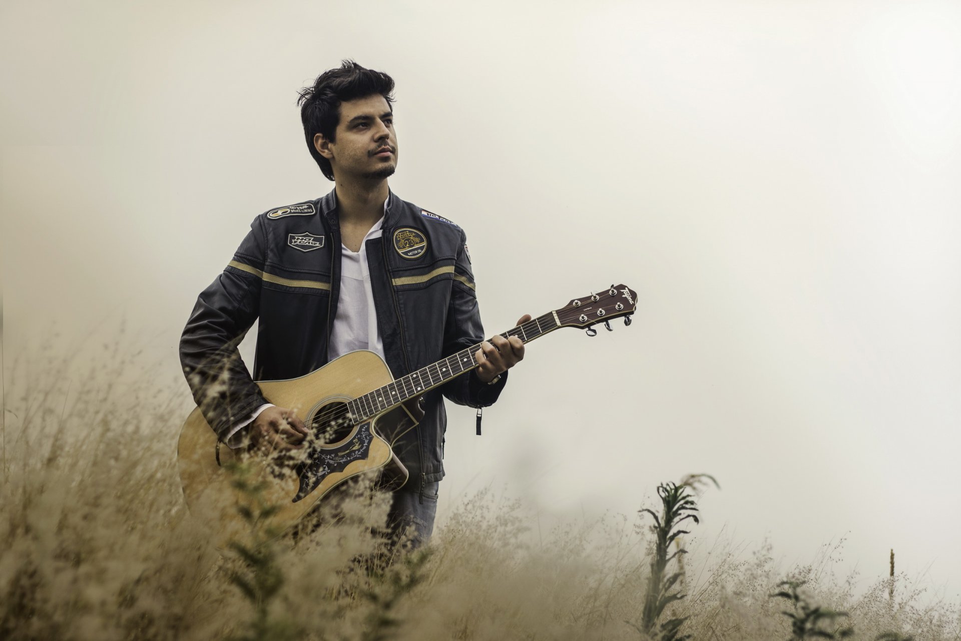 Guy guitariste marchant sur la route sur fond de montagnesGuy guitariste marchant sur la route sur fond de montagnes