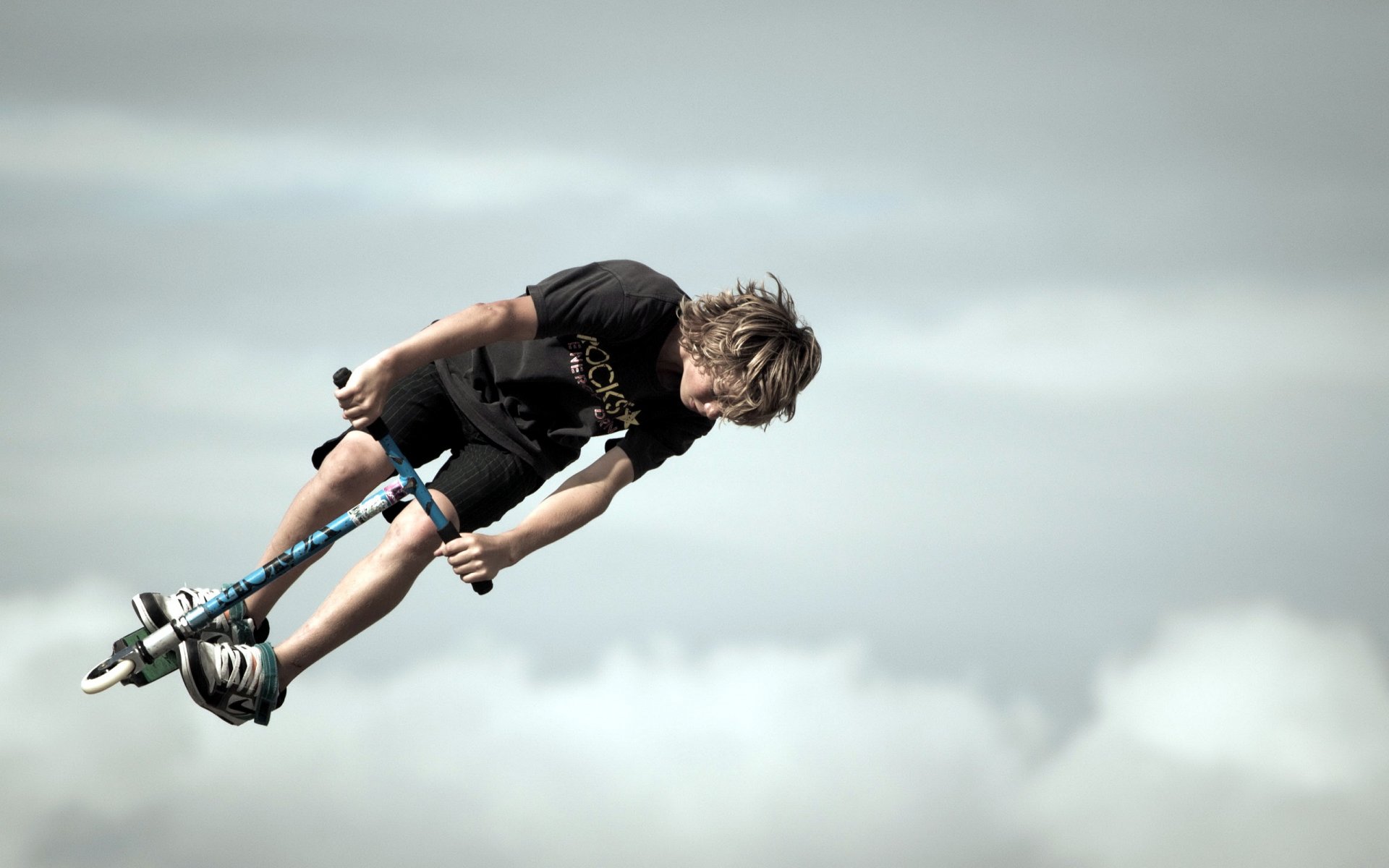 Guy en sautant sur une planche à roulettes sur fond d'alléeGuy en sautant sur une planche à roulettes sur fond d'allée