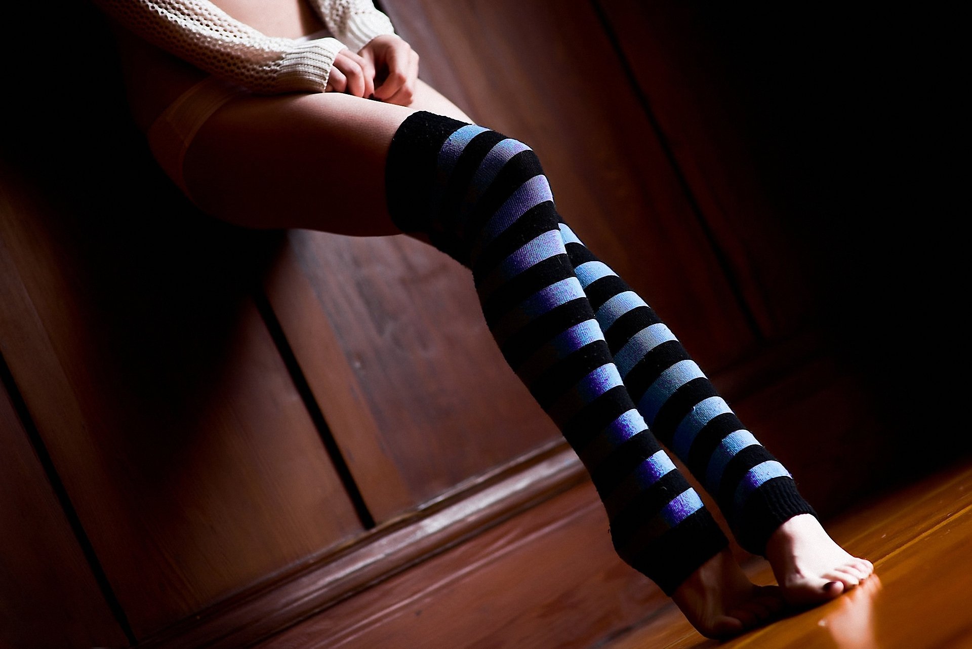 Blonde dans une robe rayée se tient au bord de la merBlonde dans une robe rayée se tient au bord de la mer