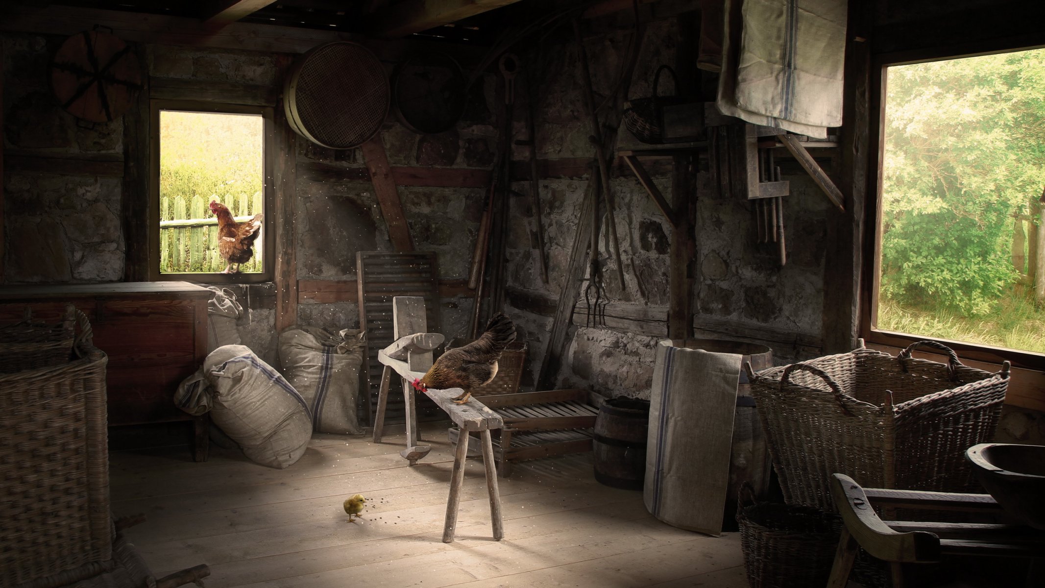 Grange rustique avec des poulets et tous les ustensilesGrange rustique avec des poulets et tous les ustensiles