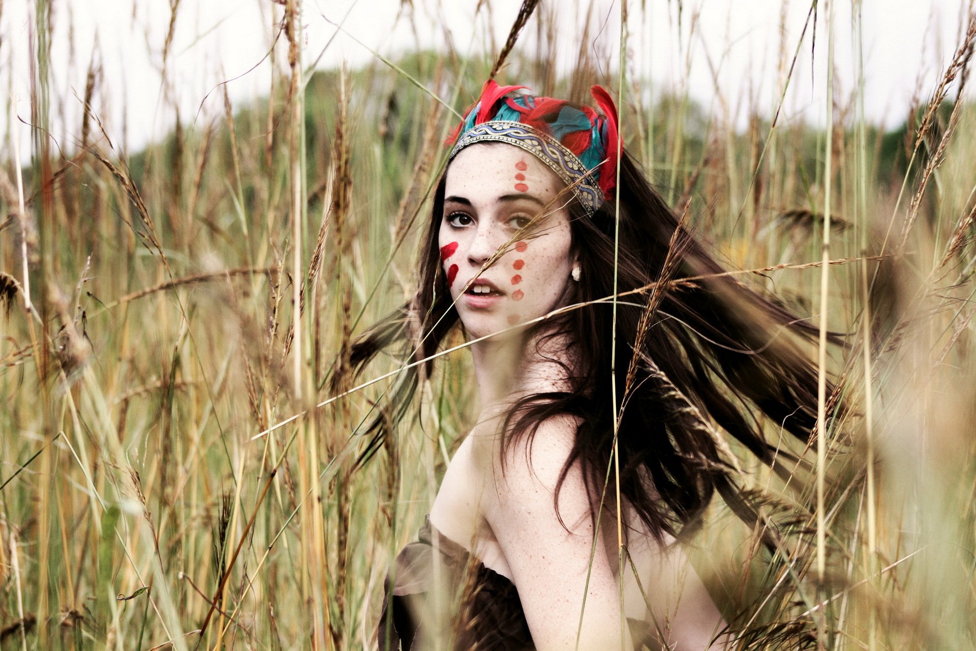 Fille dans un champ entre l'herbe et les épillets dans le style indienFille dans un champ entre l'herbe et les épillets dans le style indien