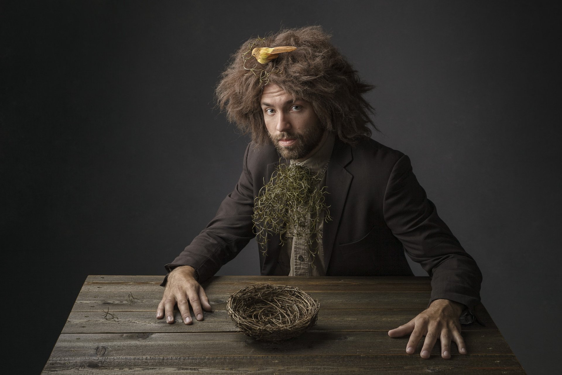 Homme exceptionnellement habillé assis à une table en boisHomme exceptionnellement habillé assis à une table en bois